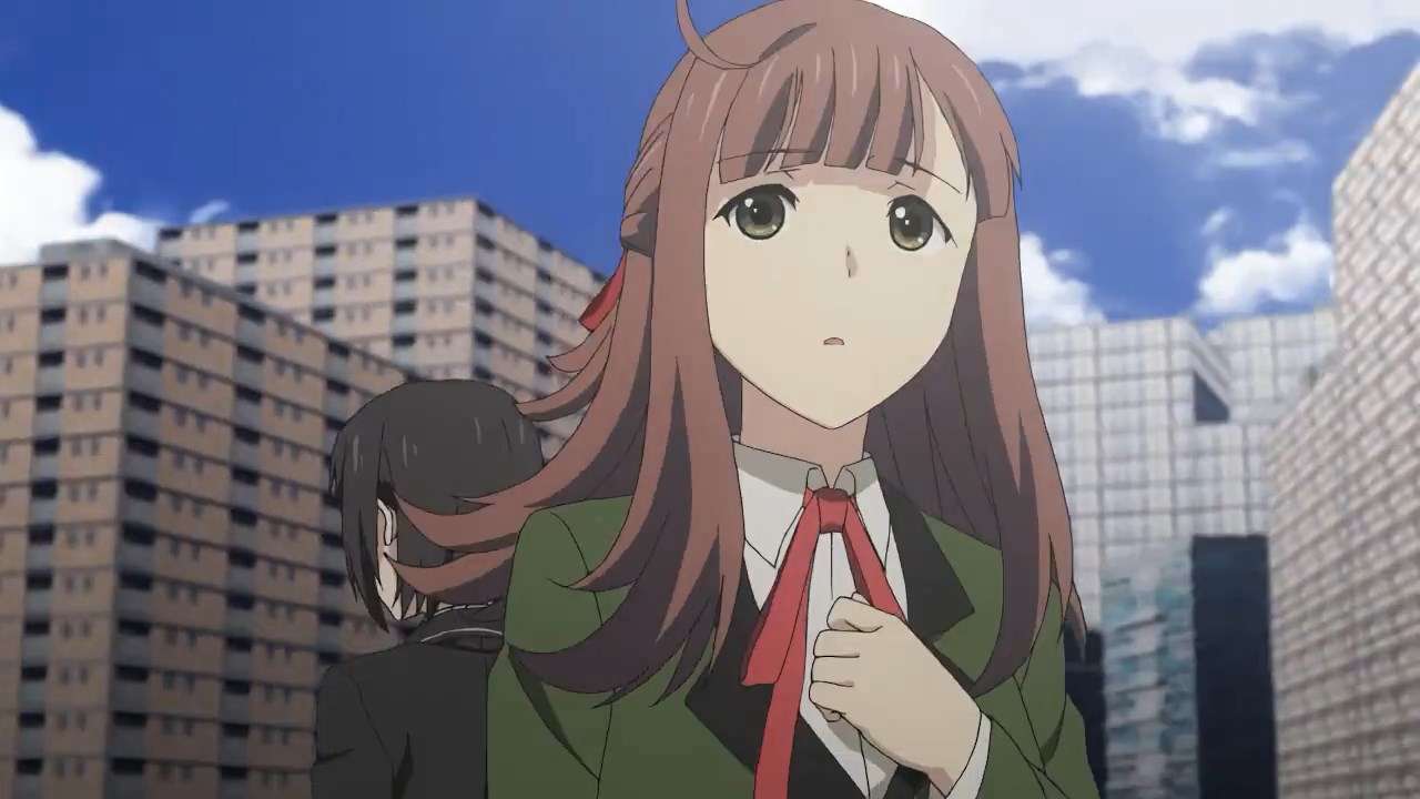 Description: A woman with long hair and a green jacket standing in front of tall buildings with a red tie on.