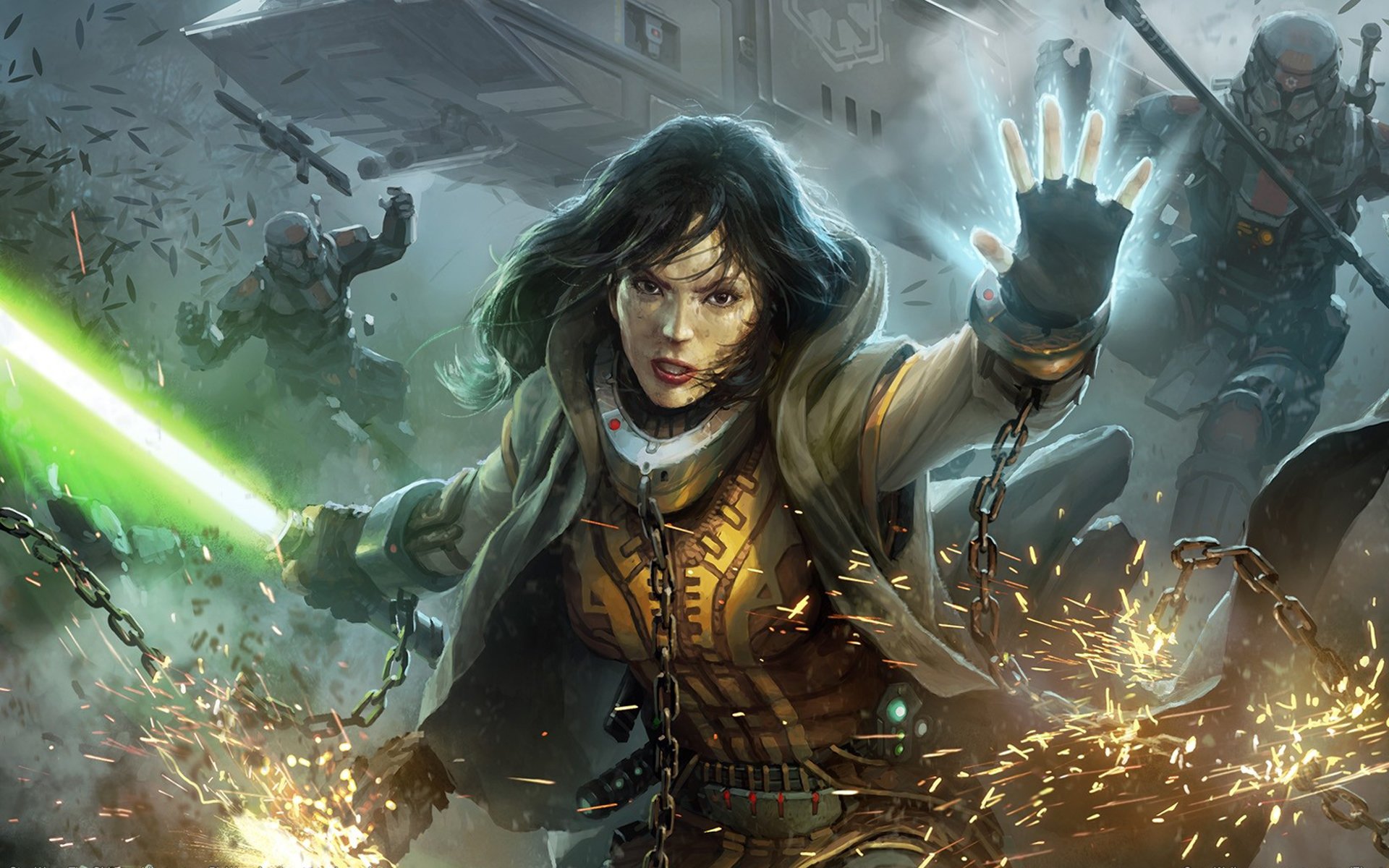 Description: A woman holding a green light saber in her hand and a star wars character in the background with a green light saber in her hand.