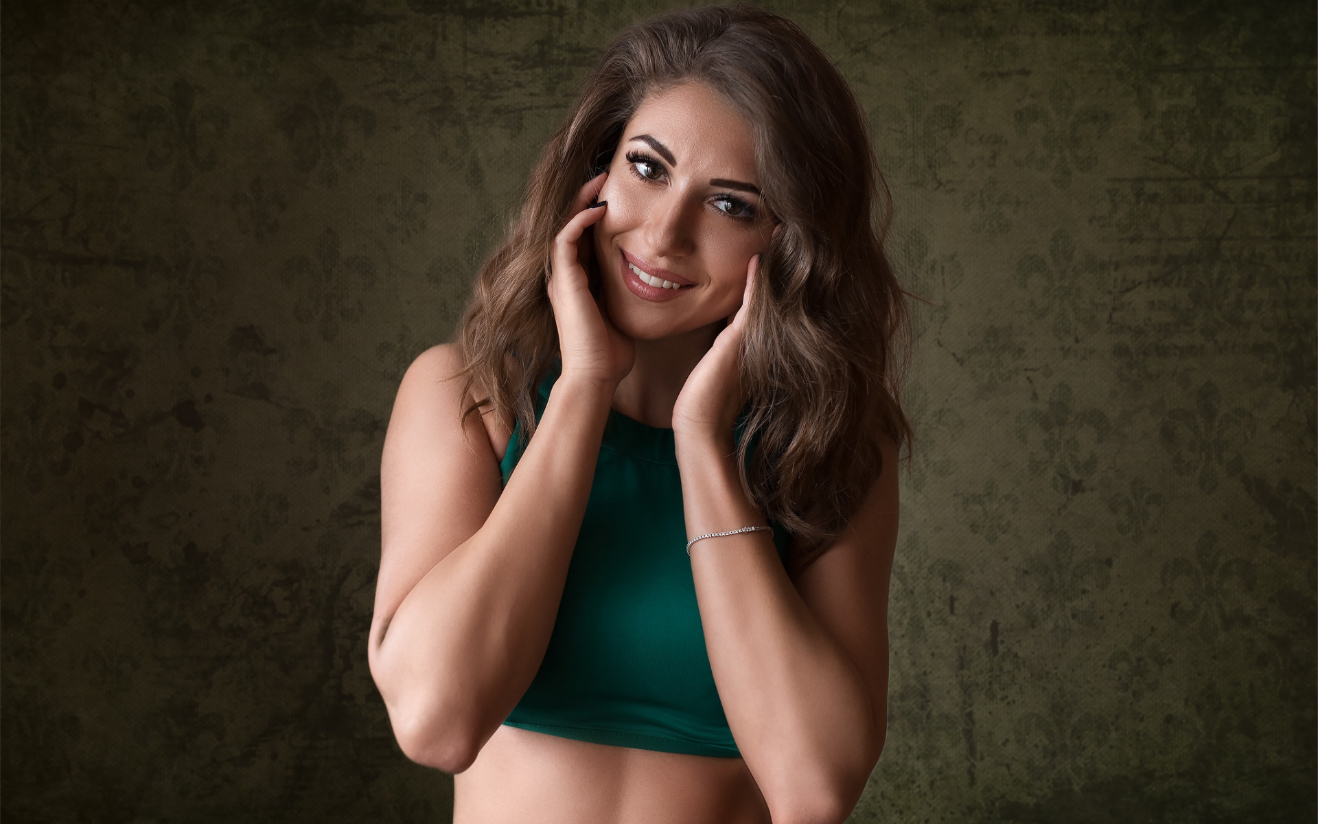 Description: A woman in a green top is posing for a picture with her hands on her face and her hand on her cheek.