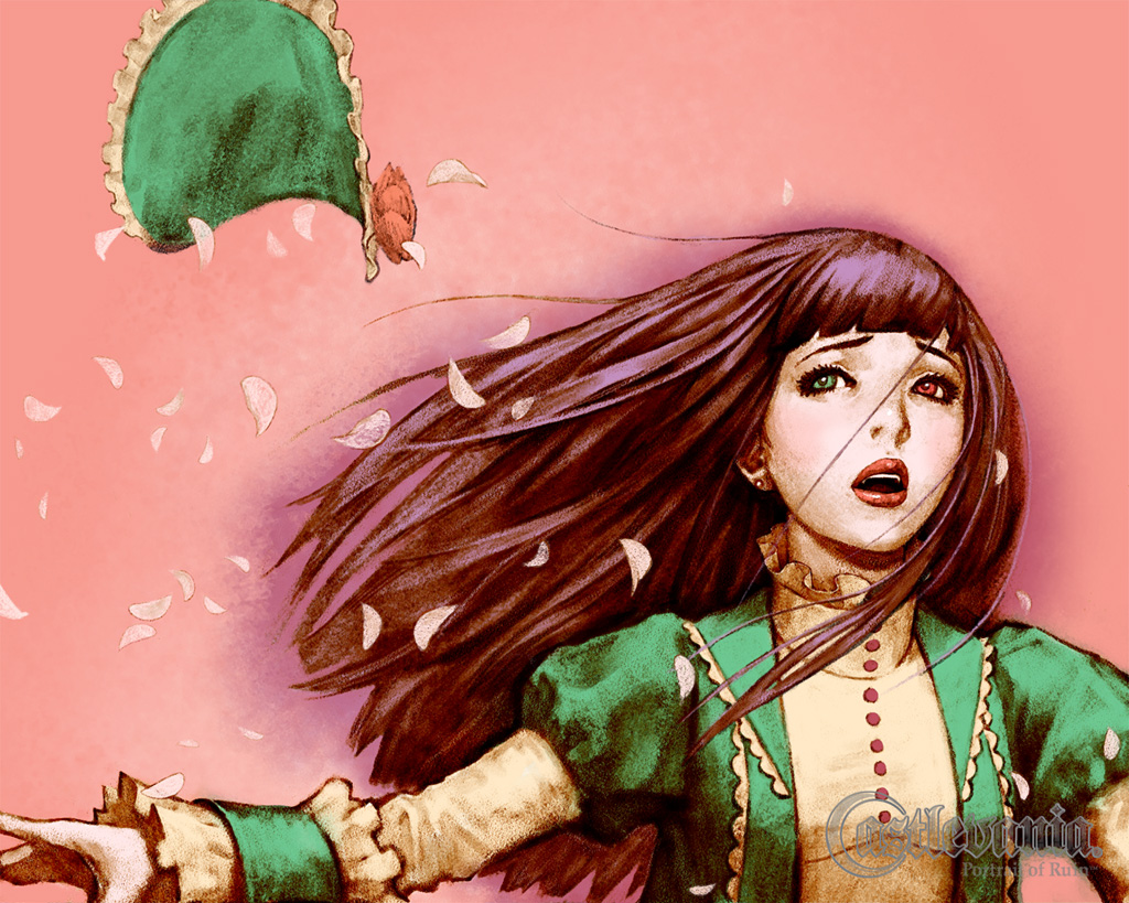 Description: A drawing of a woman with long hair and a green shirt on holding a green umbrella and a pink background.