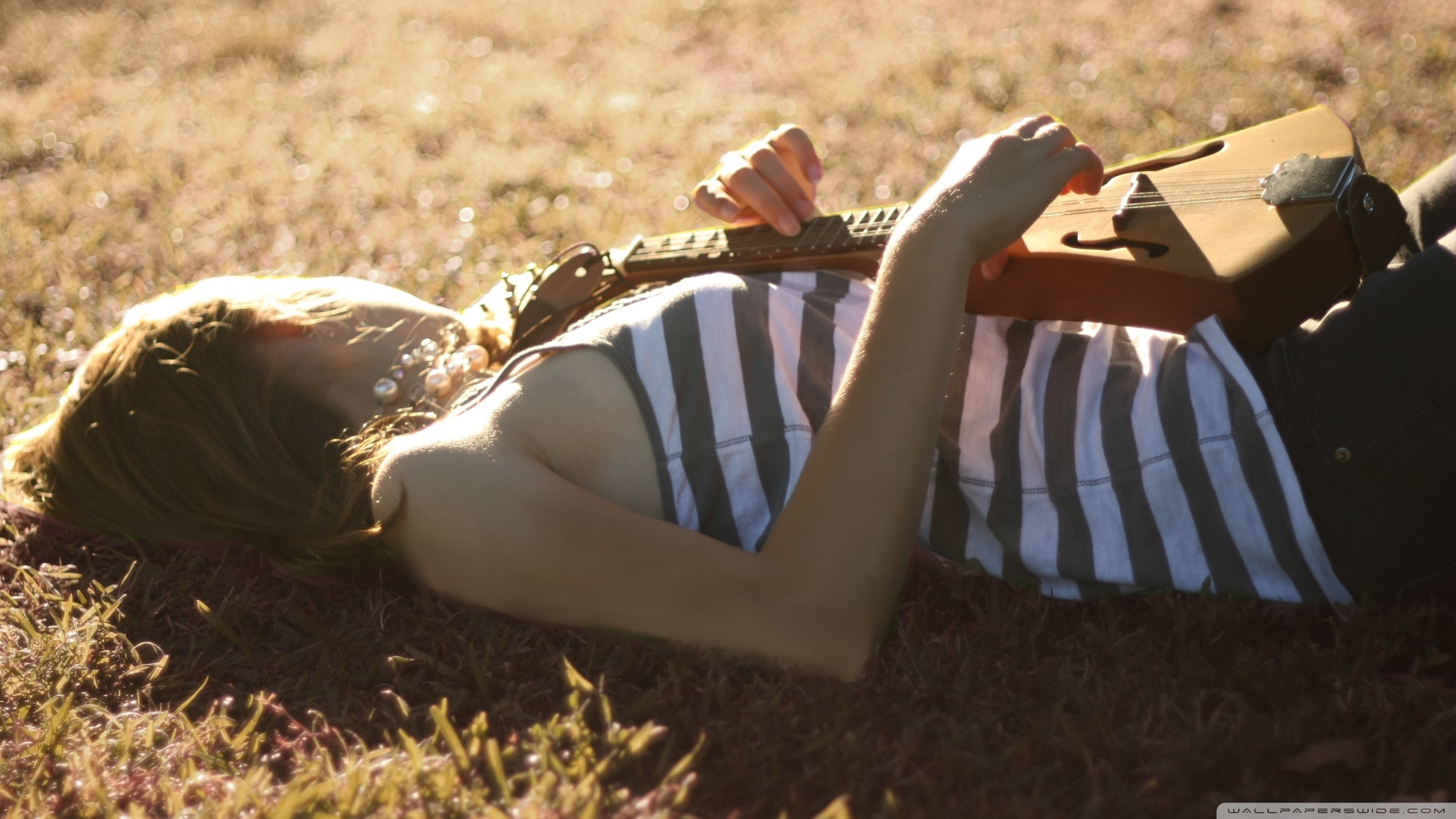 Description: A woman laying on the ground with a guitar in her hand and a book in her other hand.