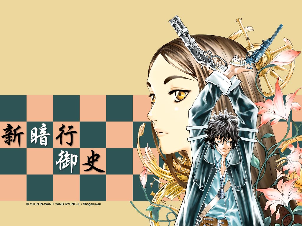 Description: A woman holding a gun in front of a checkered wallpaper with flowers and writing on it.