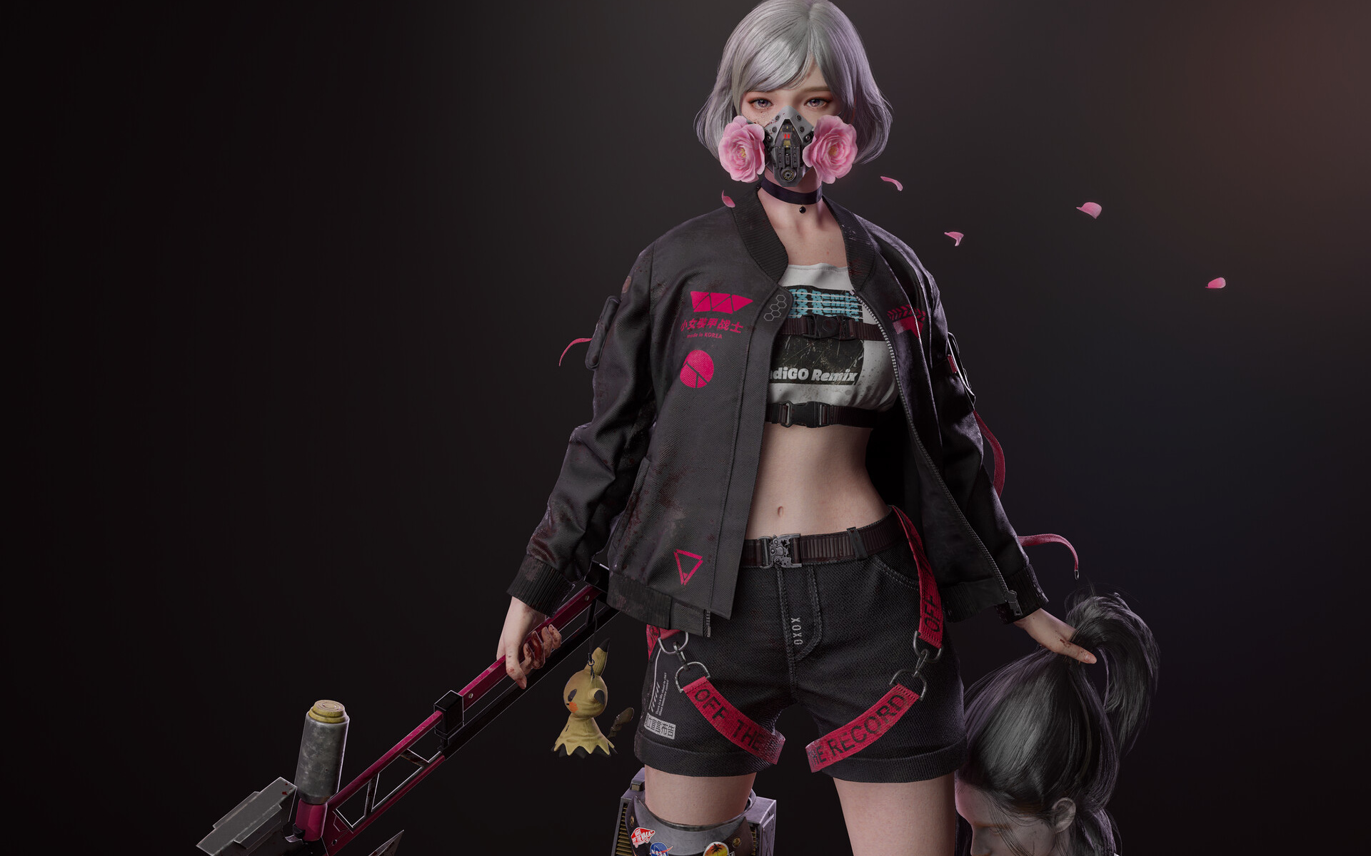 Description: A woman with a gun and a jacket on and a bag on her shoulder and a pair of gloves on her face.