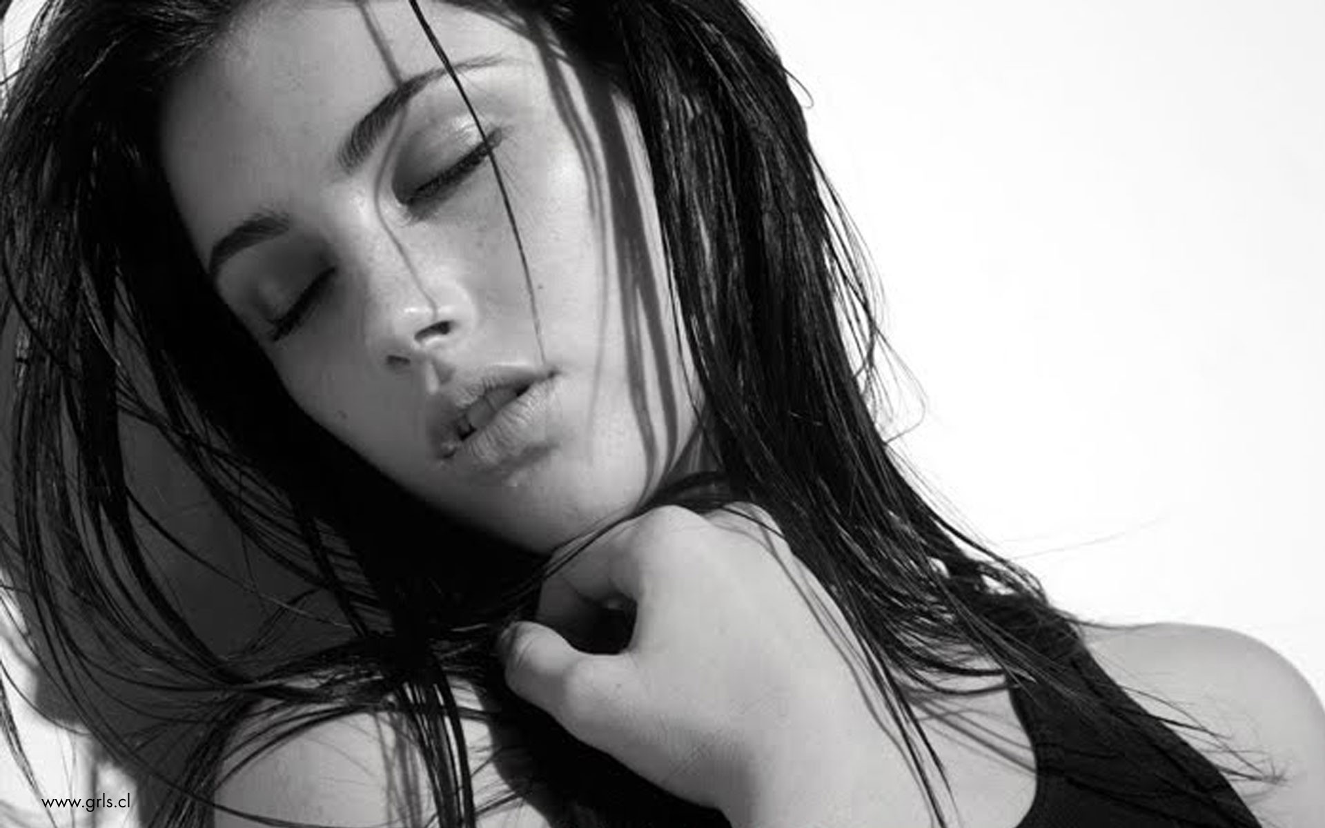 Description: A woman with her hair blowing in the wind with her eyes closed and her eyes closed.