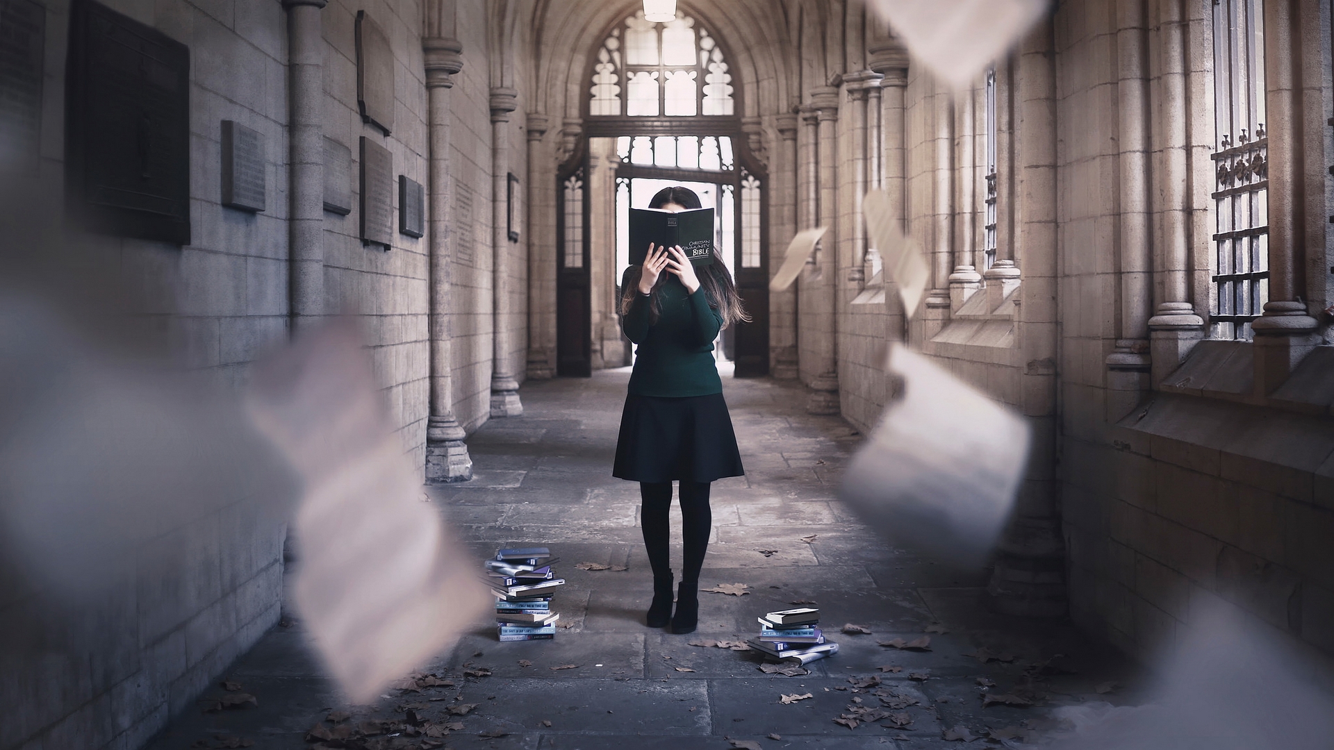 Description: A woman standing in a hallway with a hat on her head and a book in her hands.