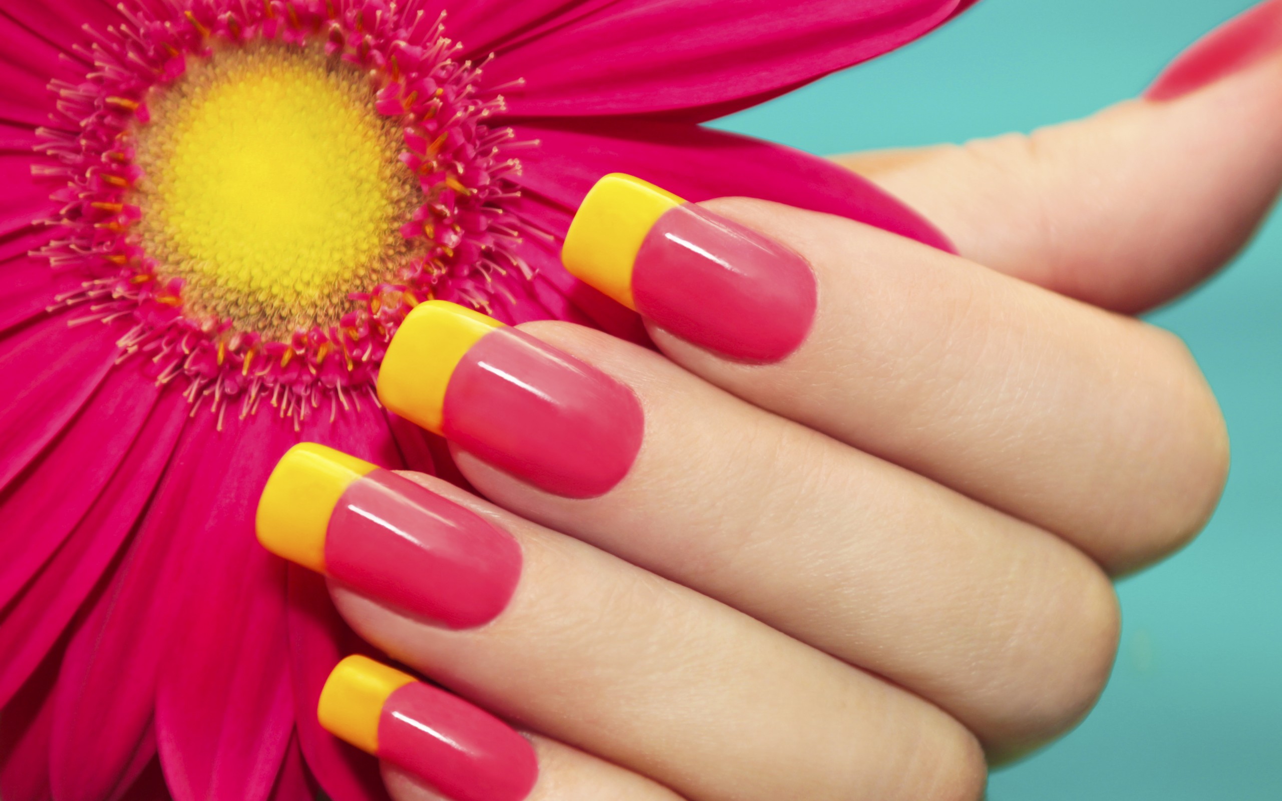 Description: A woman's hand with a pink and yellow manicure and a flower in the background with a blue background.