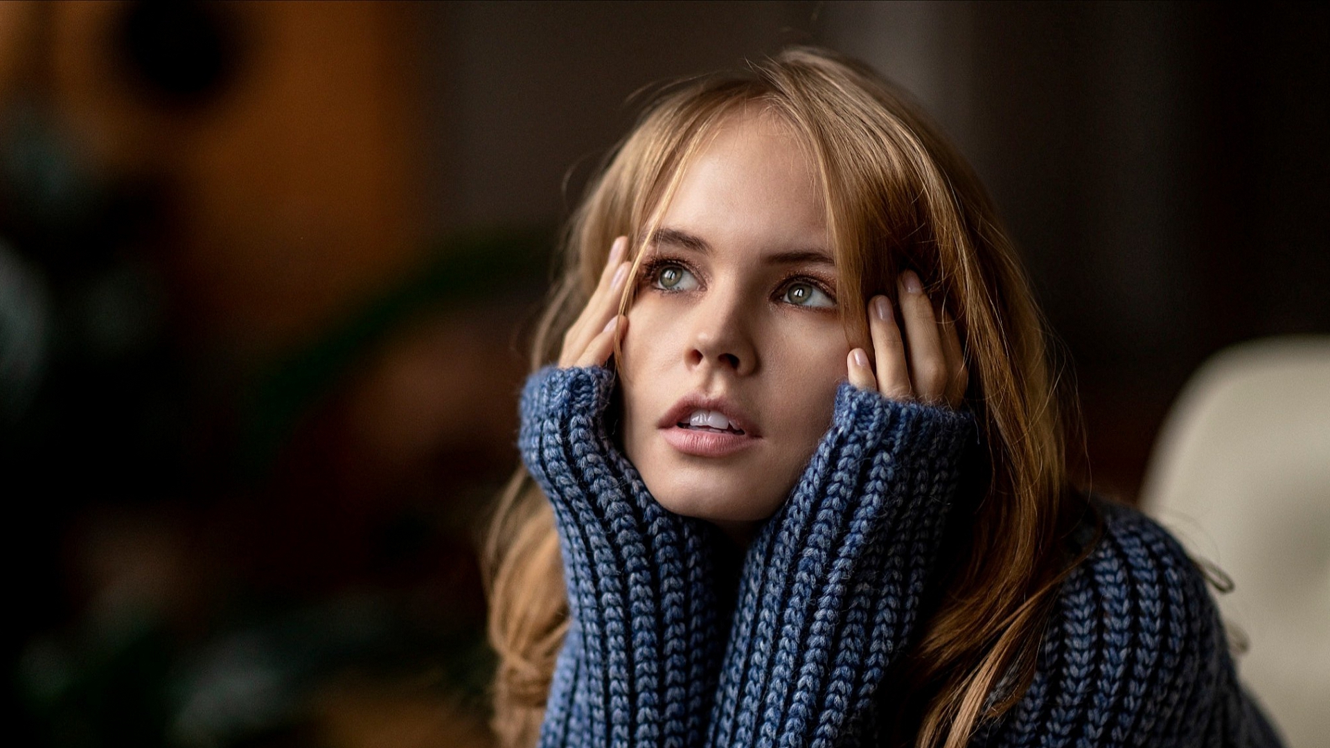 Description: A woman with her hands on her head and her hand on her head.
