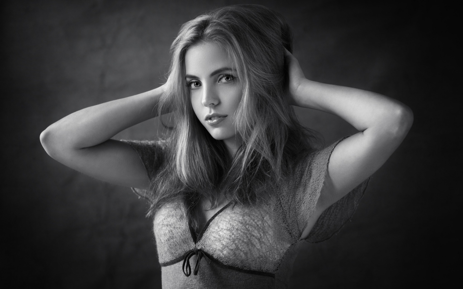Description: A woman in a gray shirt is posing for a picture with her hands on her head and her hair in her hair.