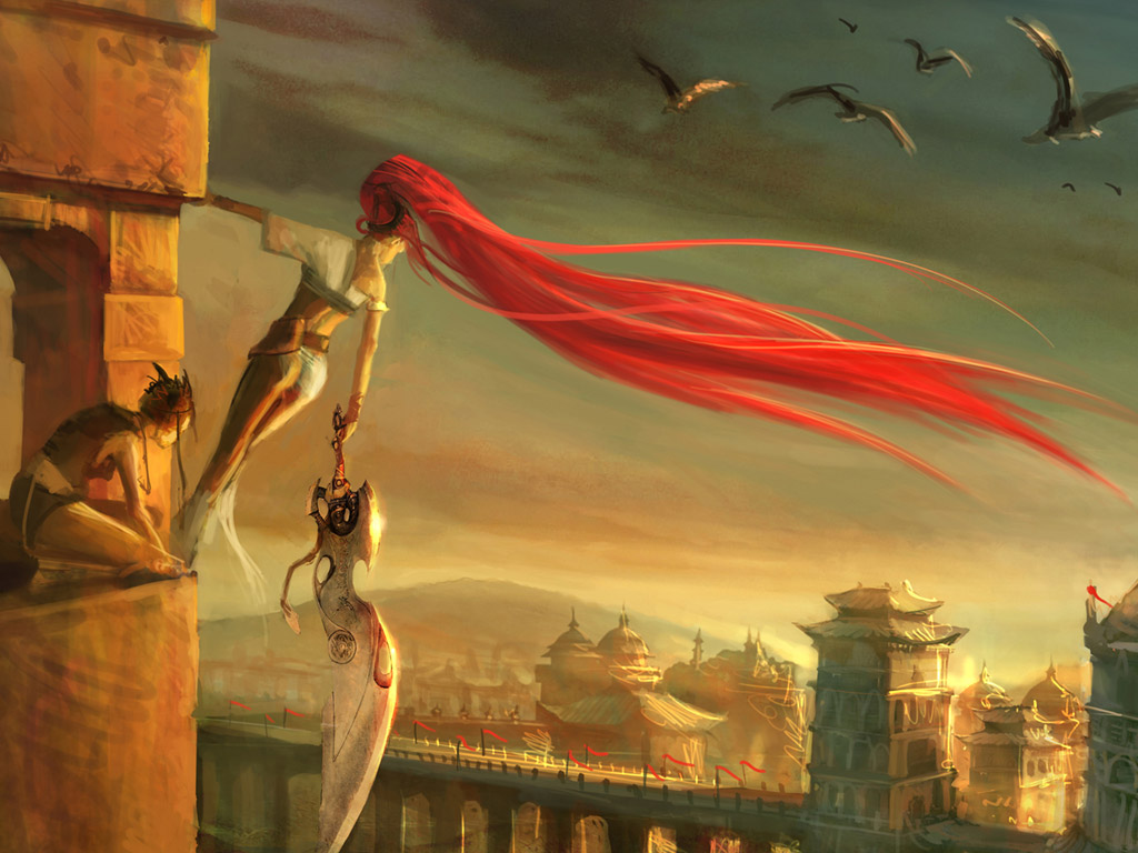 Description: A painting of a woman hanging from a building with a red hair blowing in the wind and a man standing on a ledge.