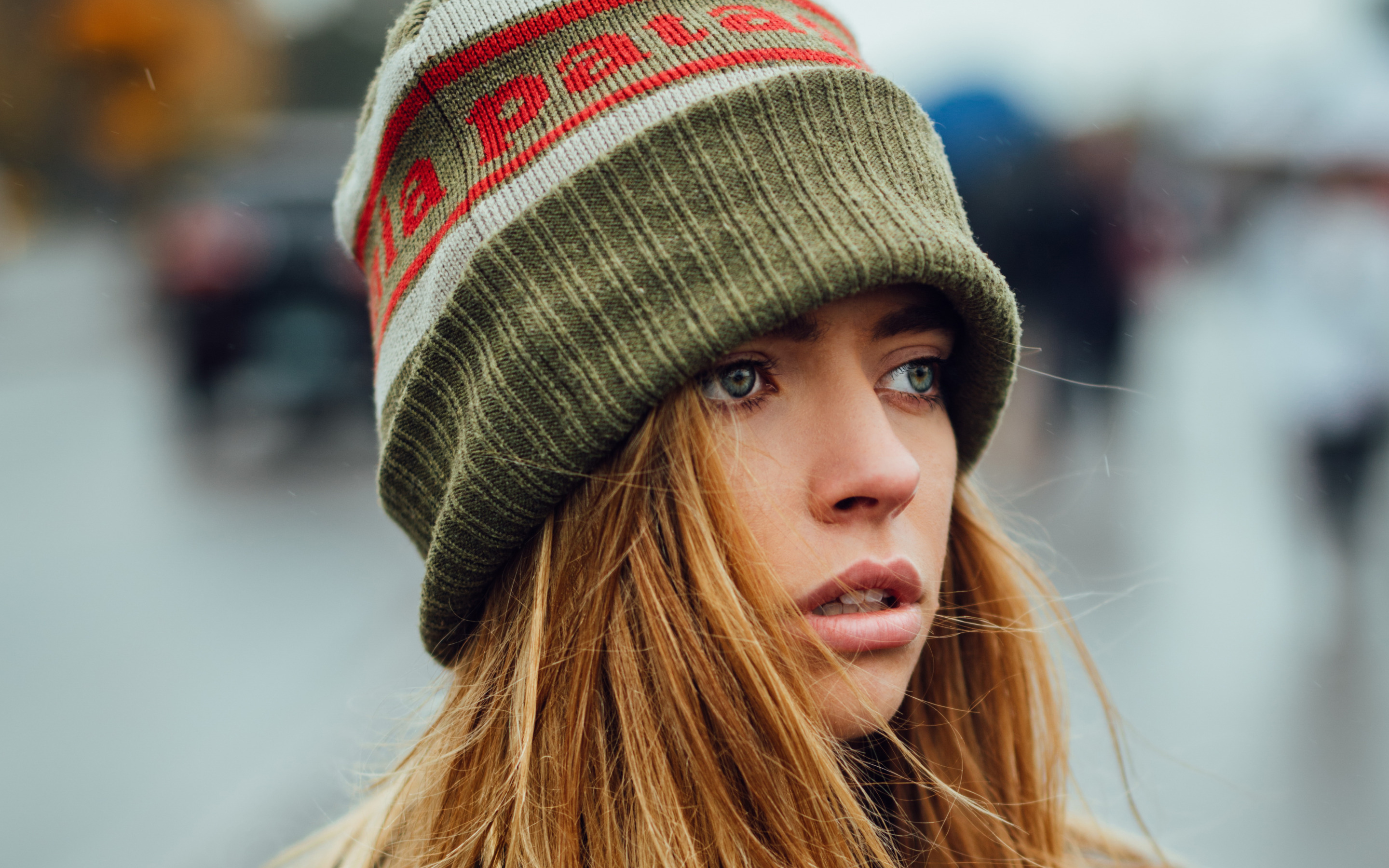 Description: A woman with a hat on is looking at something in the distance with a blurry background of a city street.
