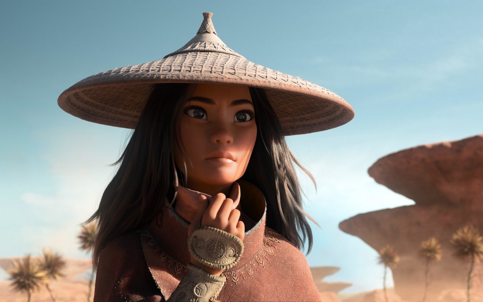 Description: A woman in a hat and a brown jacket and a desert landscape with palm trees and rocks in the background.