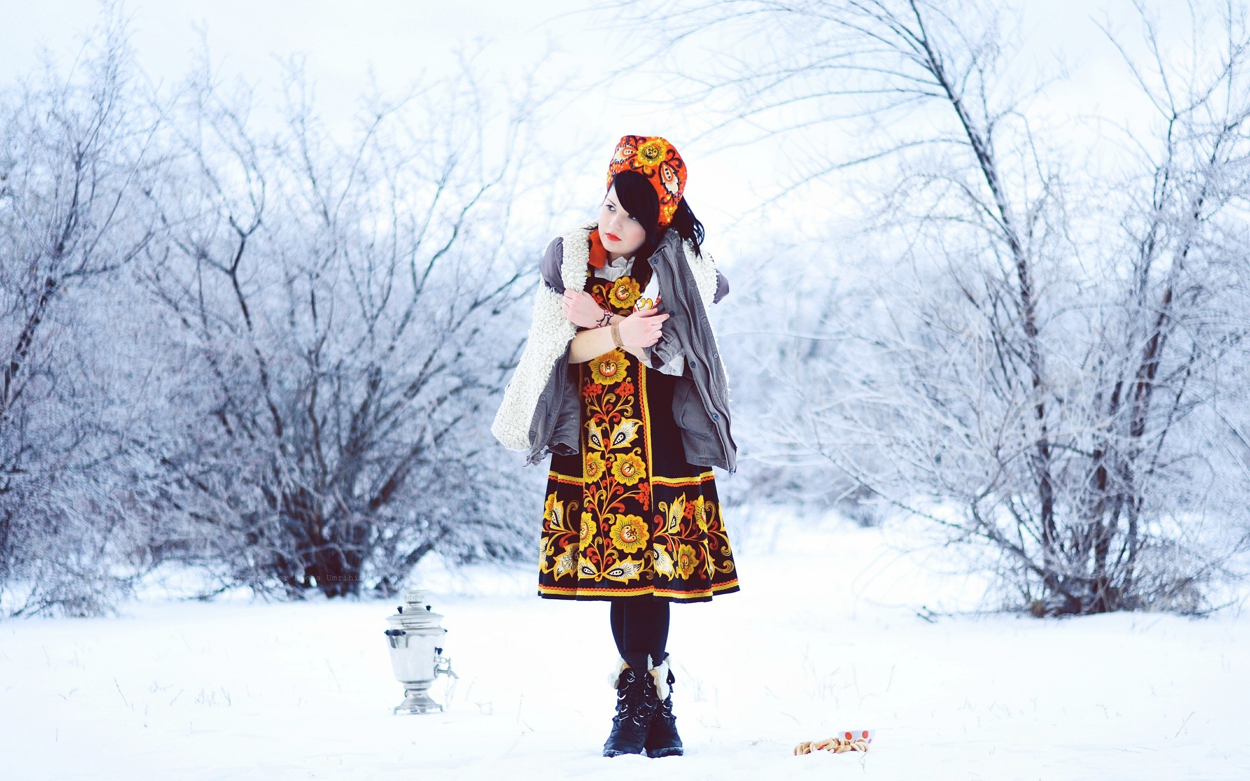 Description: A woman in a dress and hat standing in the snow with a fire hydrant in the background and trees in the background.