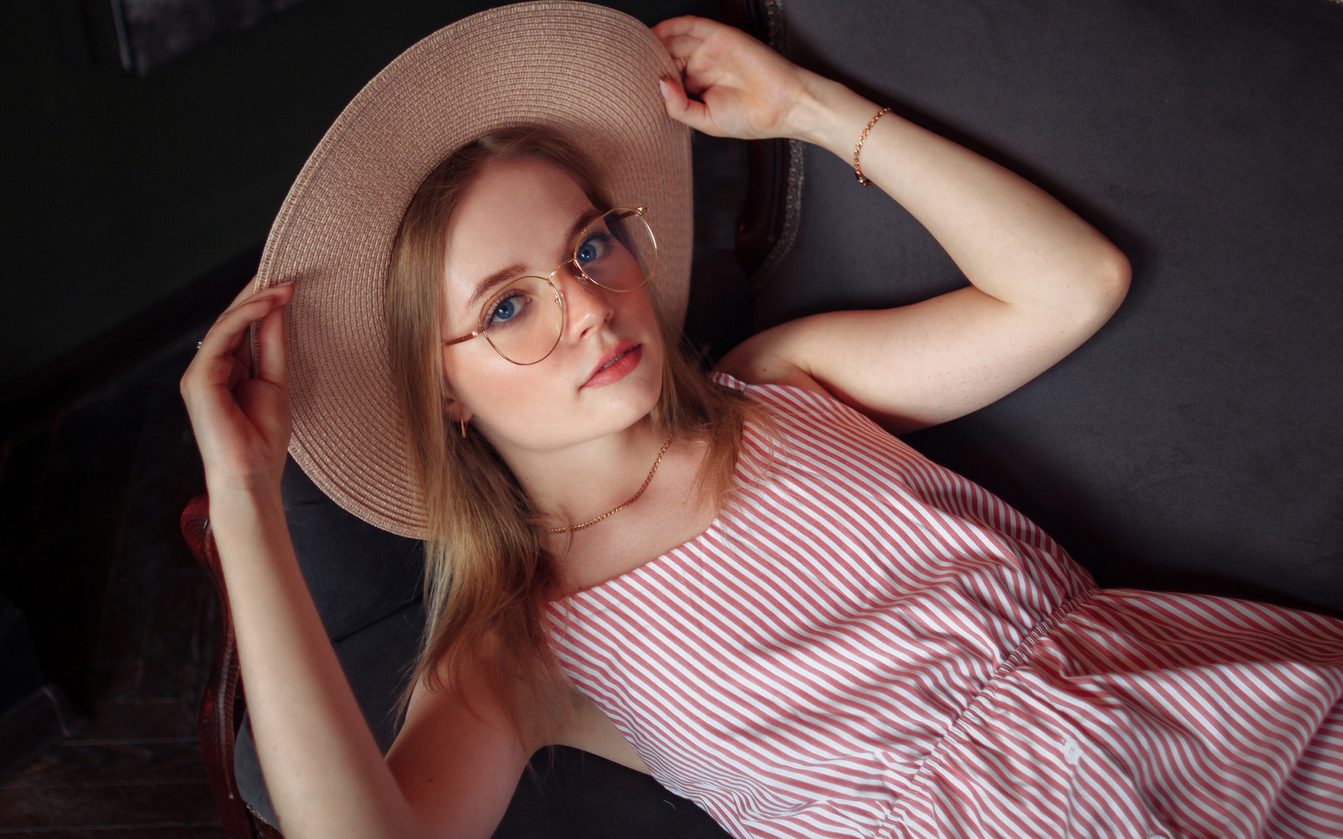 Description: A woman wearing a hat and glasses laying on a couch with her hands on her head and her arm behind her head.