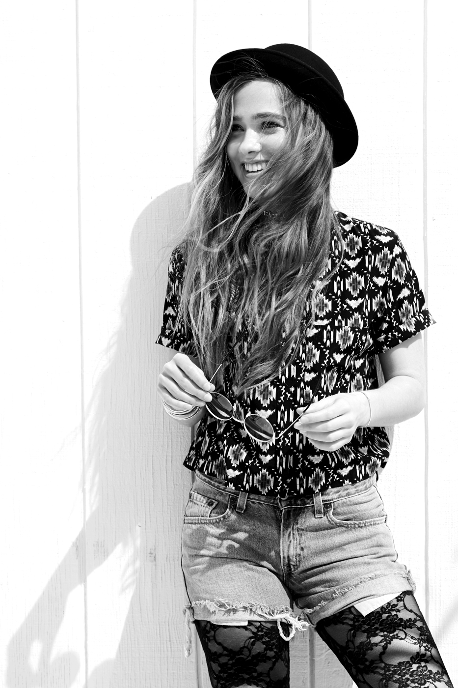 Description: A woman in a hat and jeans posing for a picture with her hair blowing in the wind and her hat on her head.
