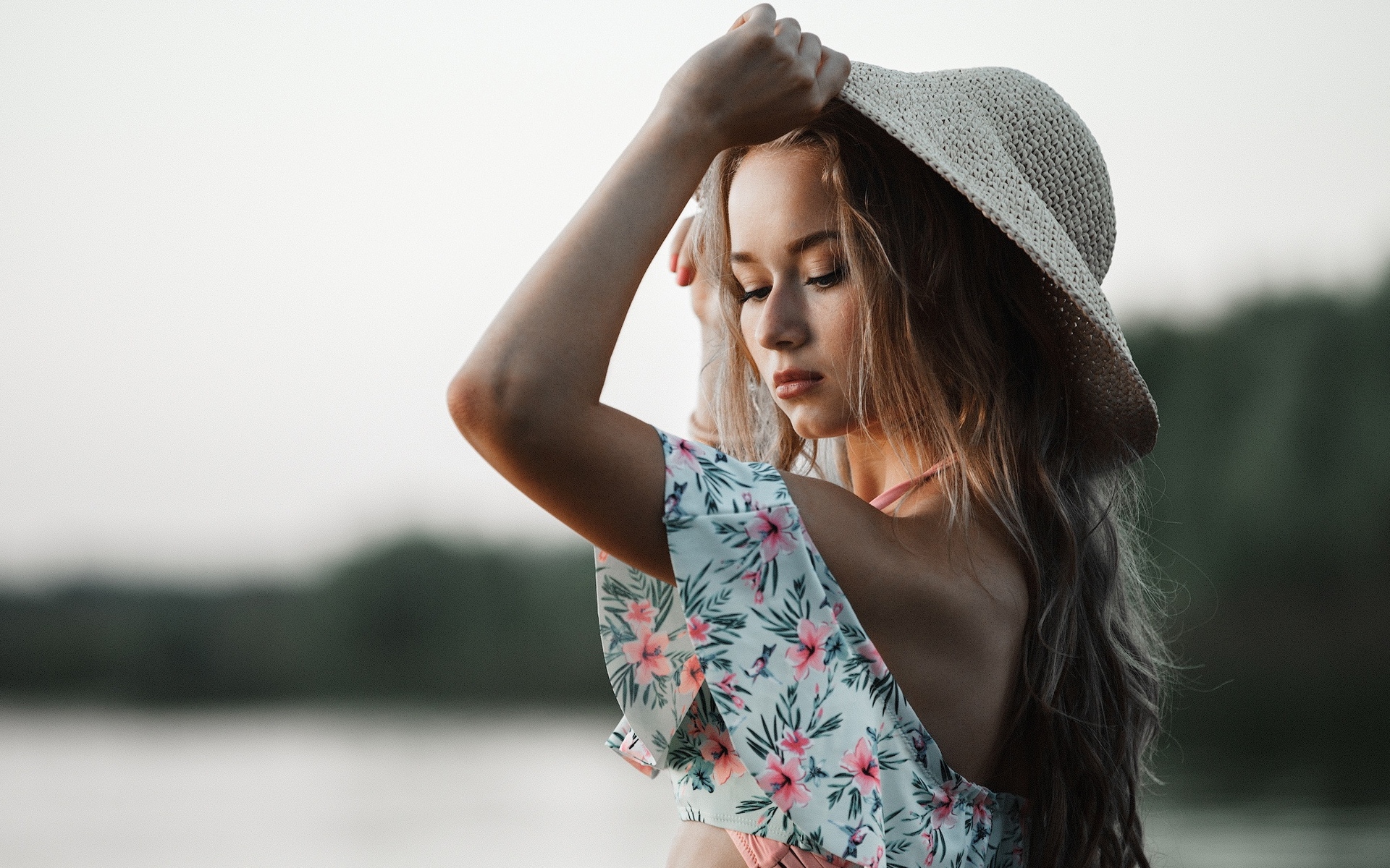 Description: A woman in a hat is standing by a lake and looking down at her hair and shoulders.