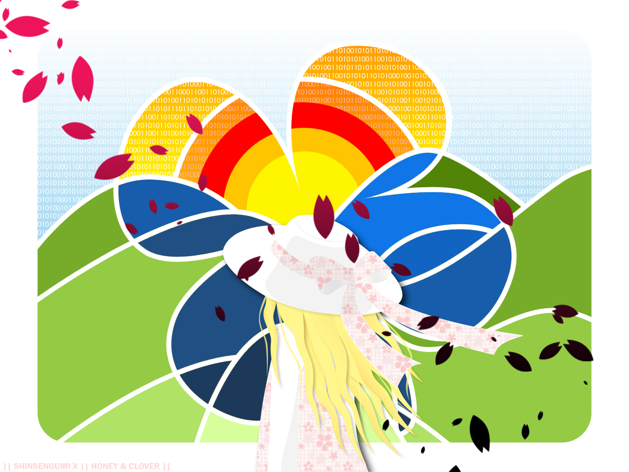 Description: A woman with a hat and a dress with leaves on it and a rainbow in the background with a flower.