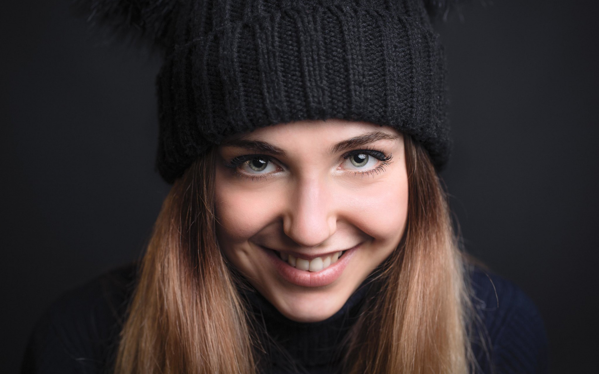 Description: A woman with long hair wearing a black hat with a fuzzy pom pom on it's head.