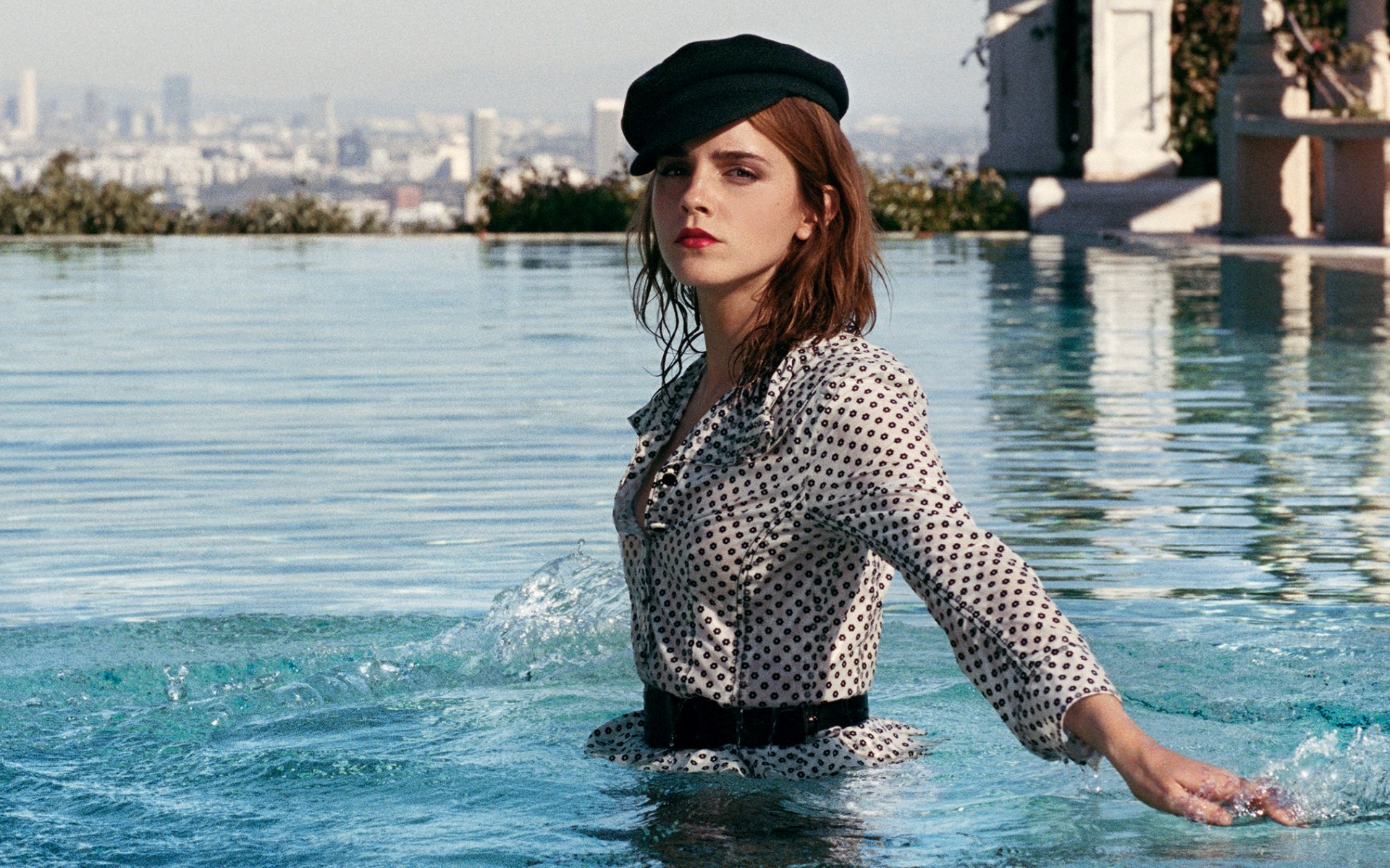 Description: A woman in a hat is in a pool of water with a city in the background in the foreground.
