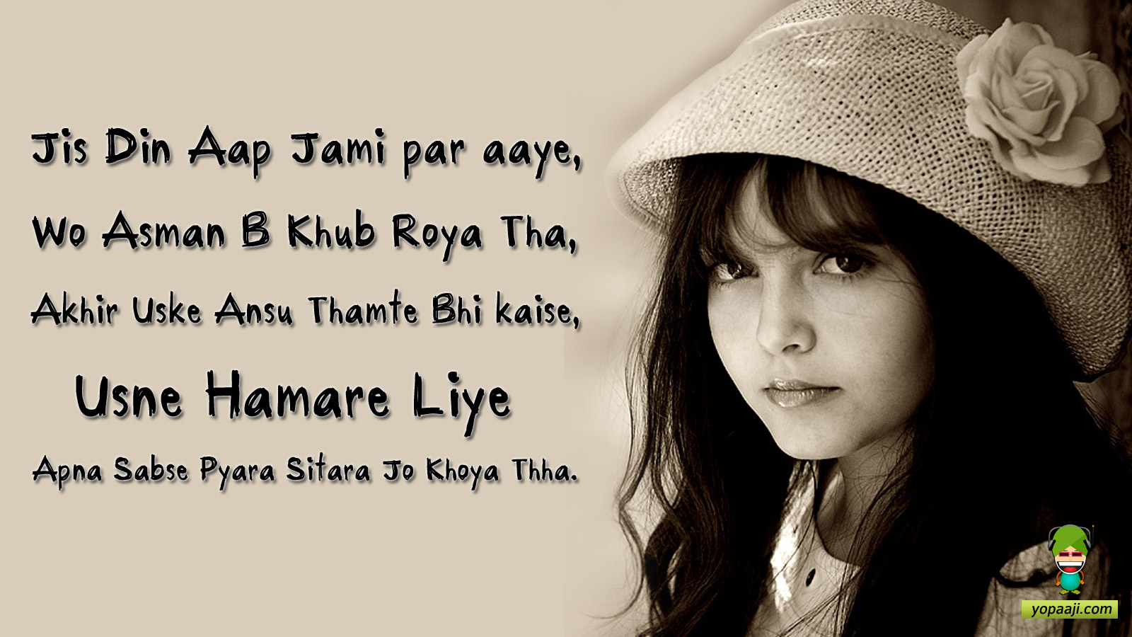 Description: A woman with a hat on her head and a quote on the side of her face that says.