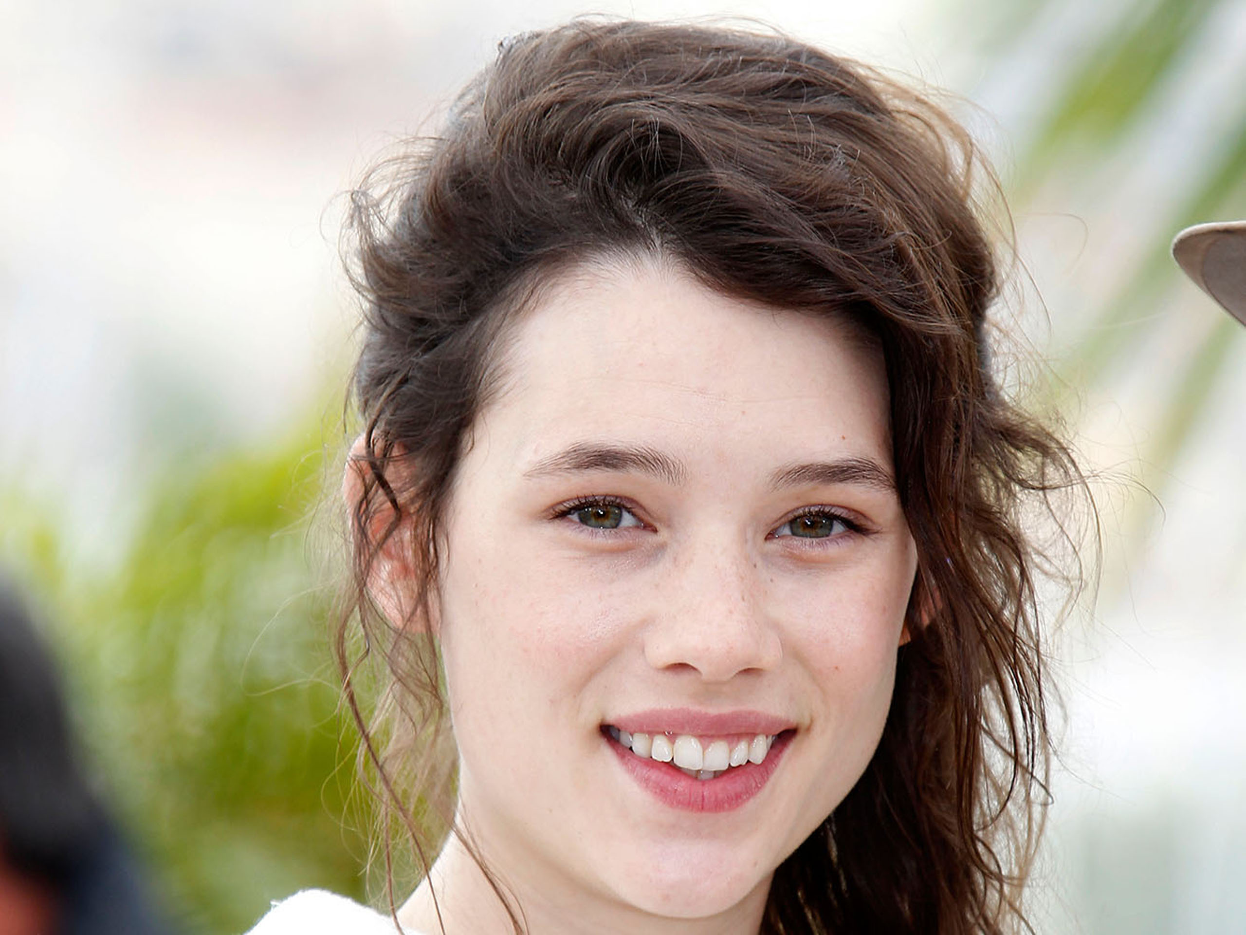 Description: A woman with a hat on her head smiling at the camera with a man in the background behind her.