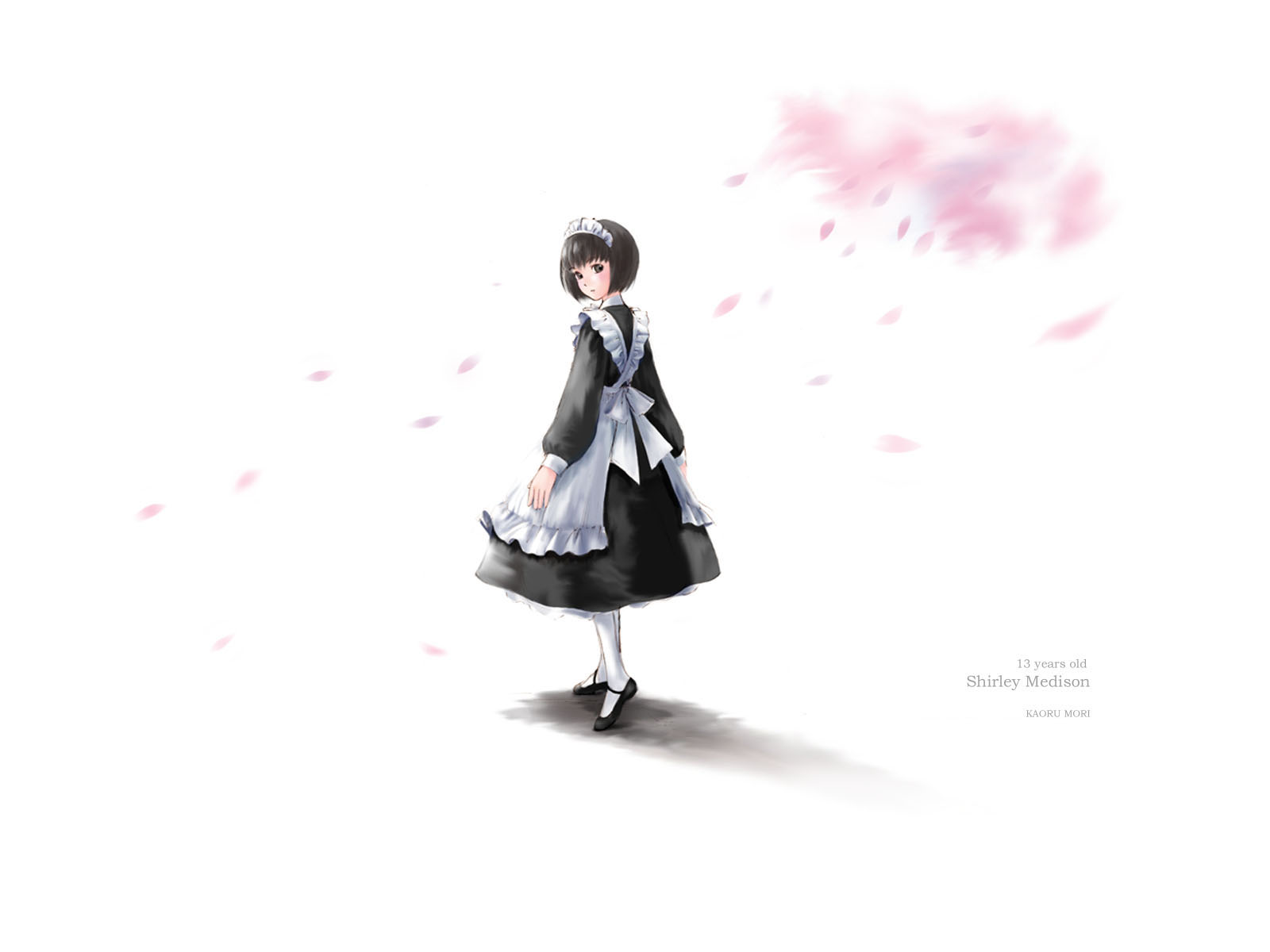 Description: A woman in a dress and hat standing in the snow with a pink flower in her hair and a black and white dress.