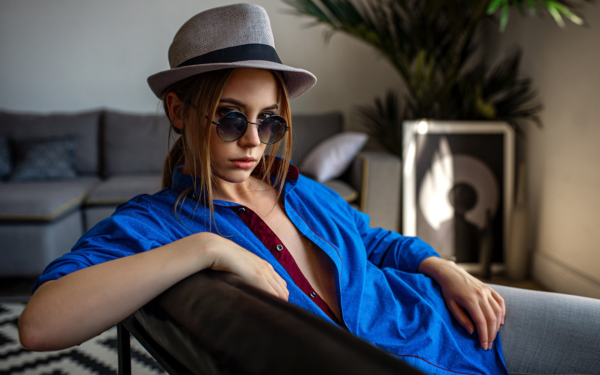 Description: A woman wearing a hat and sunglasses sitting on a couch in a living room with a plant in the corner.