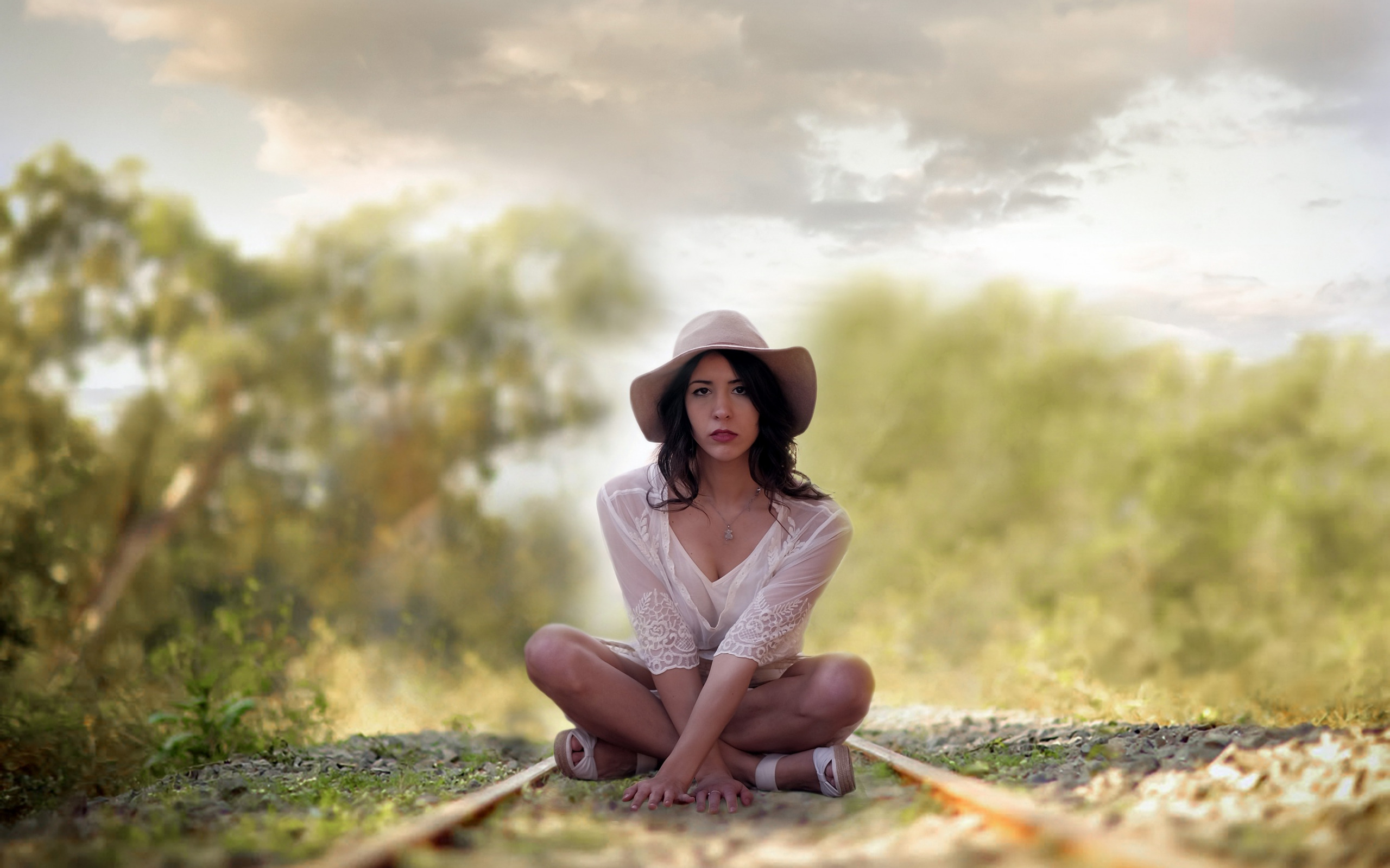Description: A woman in a hat sitting on a train track in the woods with a train track in the background.
