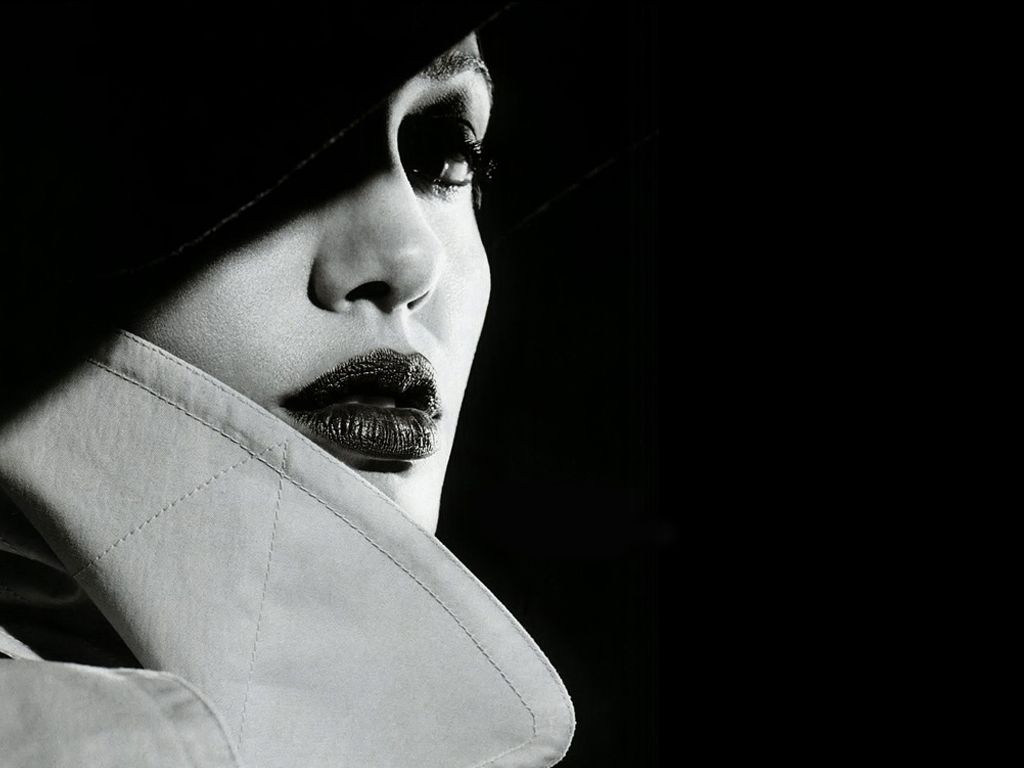 Description: A woman with a hat and a trench coat on her head and a black background with a black background.