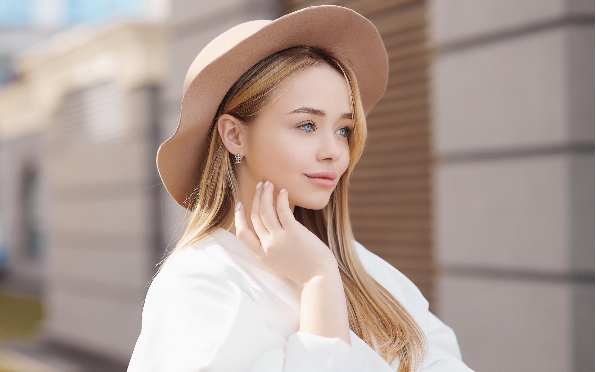 Description: A woman wearing a hat and white shirt posing for a picture with her hand on her chin and her hand on her chin.