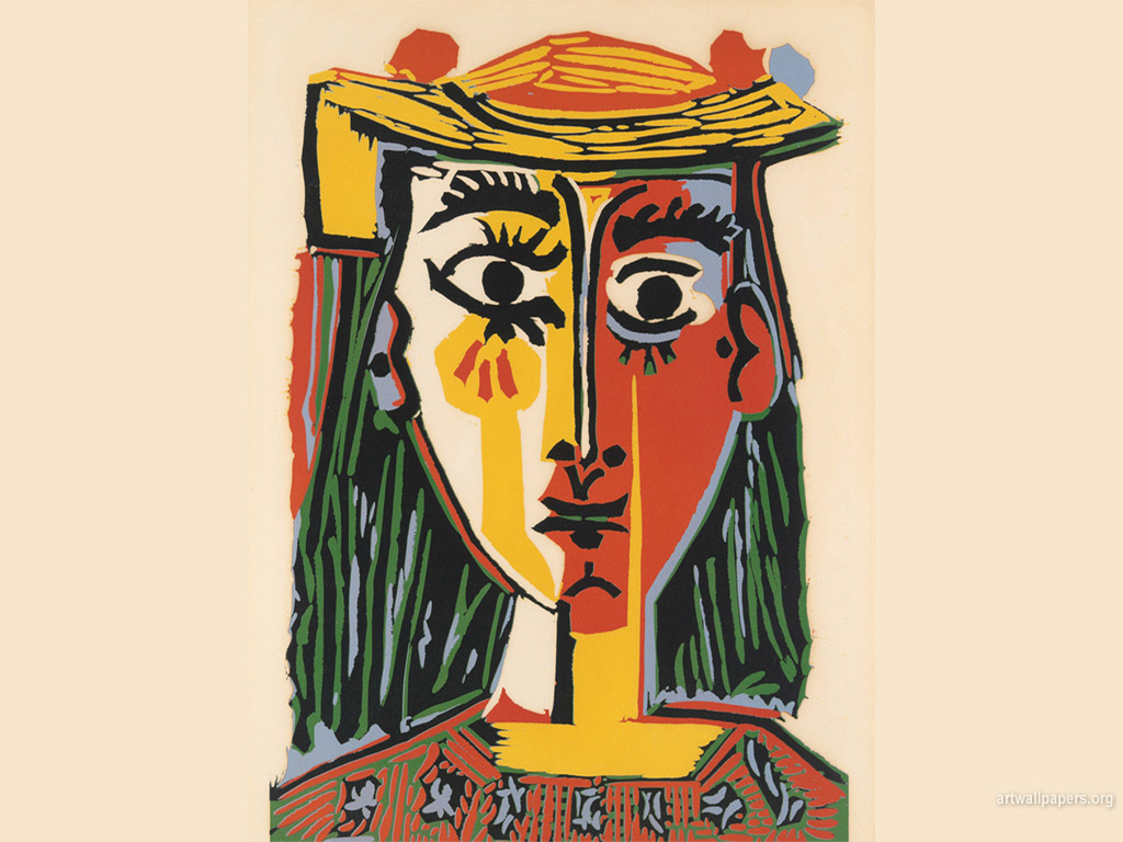 Description: A painting of a woman with a hat on her head and a yellow background with a red.