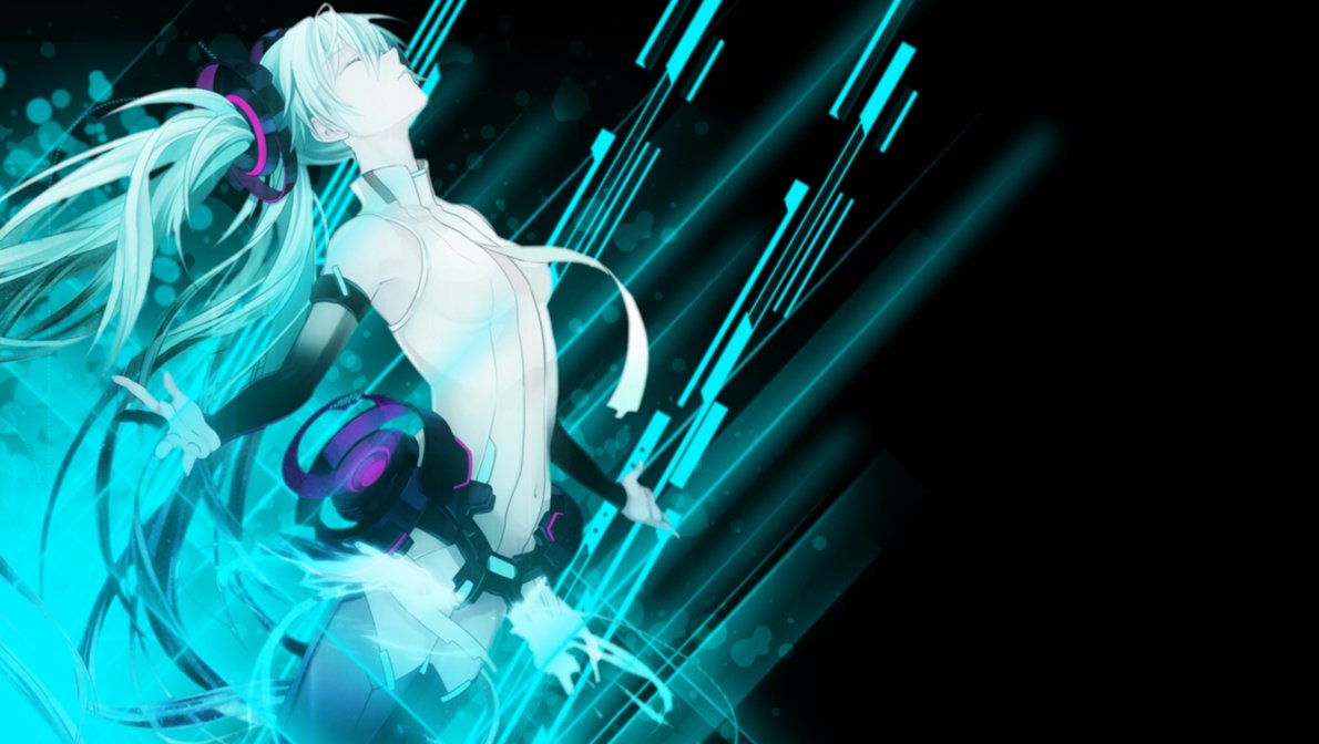 Description: A woman with headphones on her ears and a black background with blue lines and lines around her head.