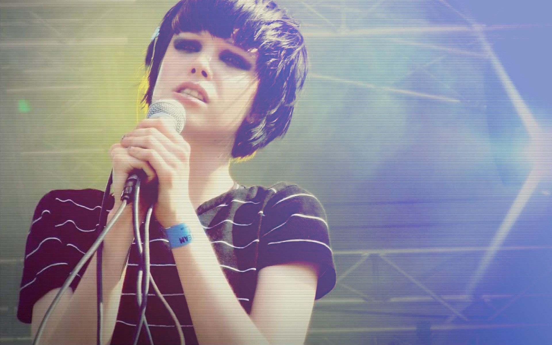 Description: A woman with headphones on holding a microphone in front of a stage backdrop with lights and a geometric pattern.