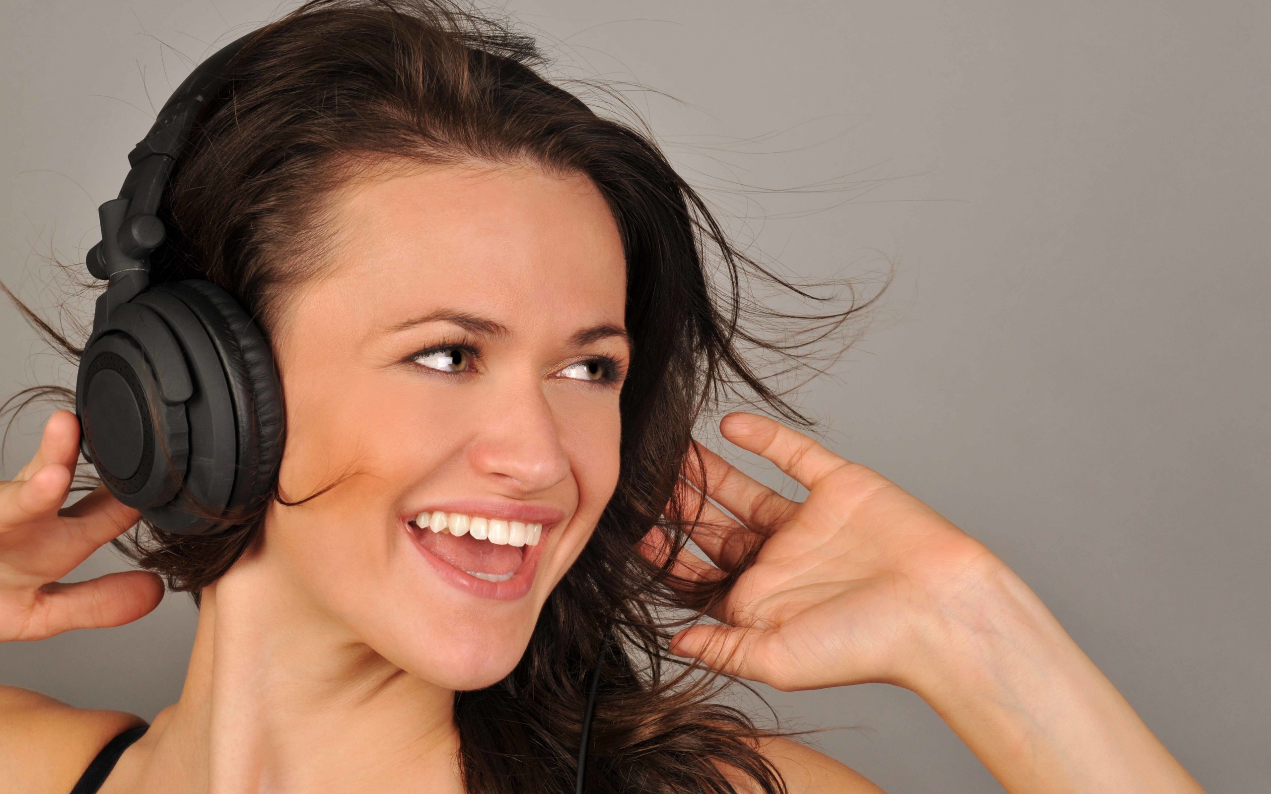 Description: A woman with headphones on smiling and looking at the camera with a smile on her face and her hair blowing in the wind.