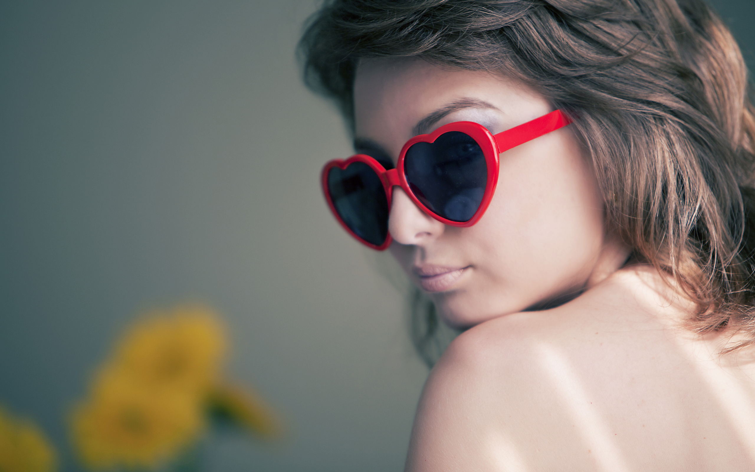 Description: A woman wearing heart shaped sunglasses with a flower in the background and a gray wall behind her.