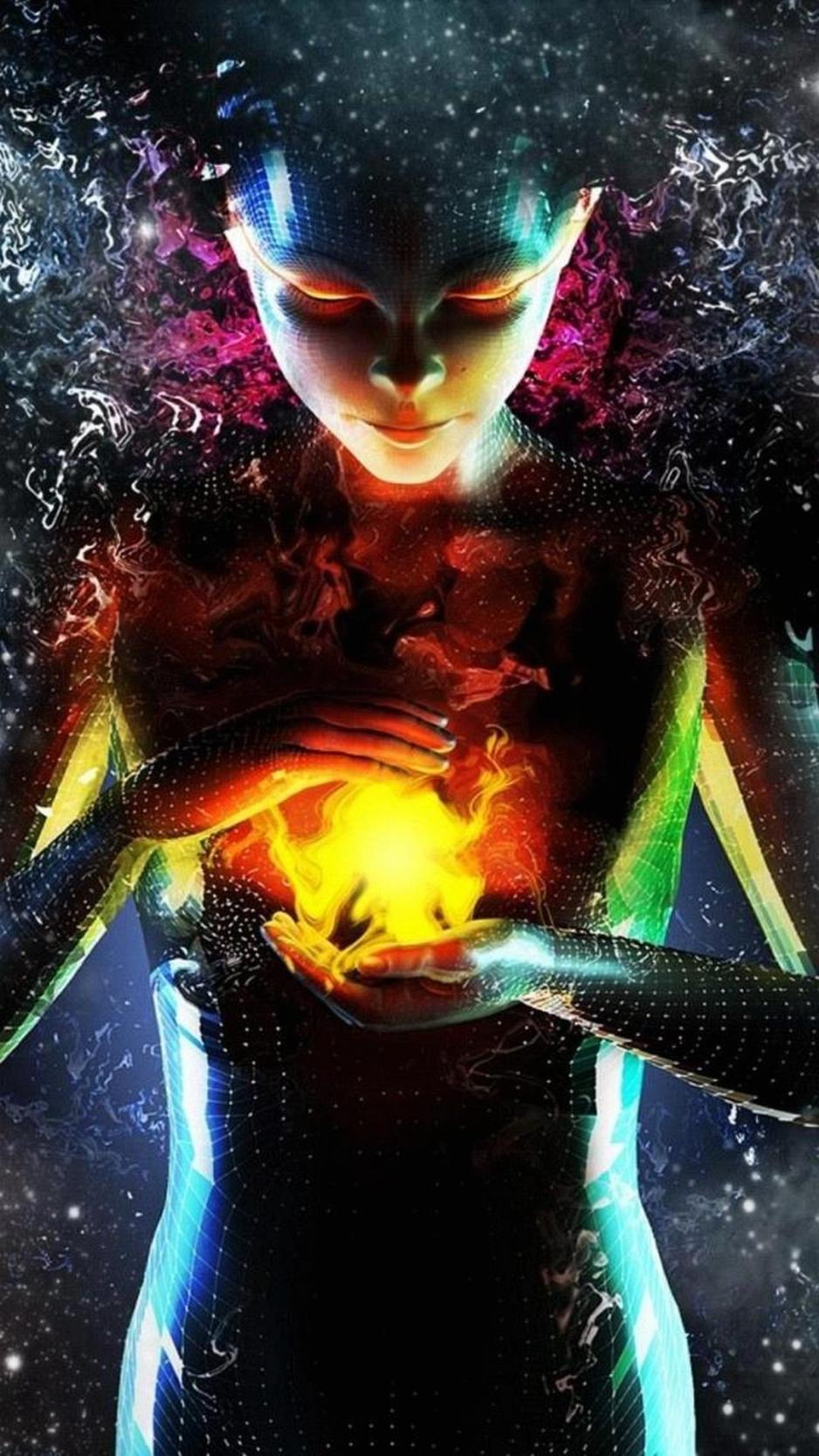 Description: A woman holding a ball of fire in her hands with a space background behind her and stars in the sky.