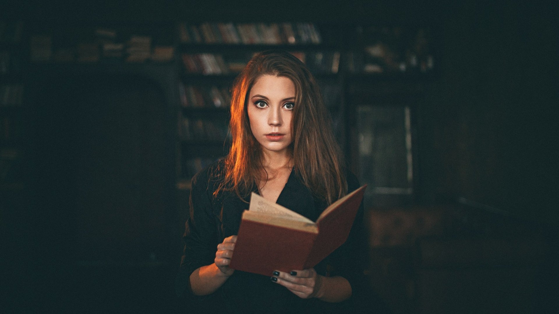 Description: A woman holding a book in her hands and looking at the camera with a serious look on her face.