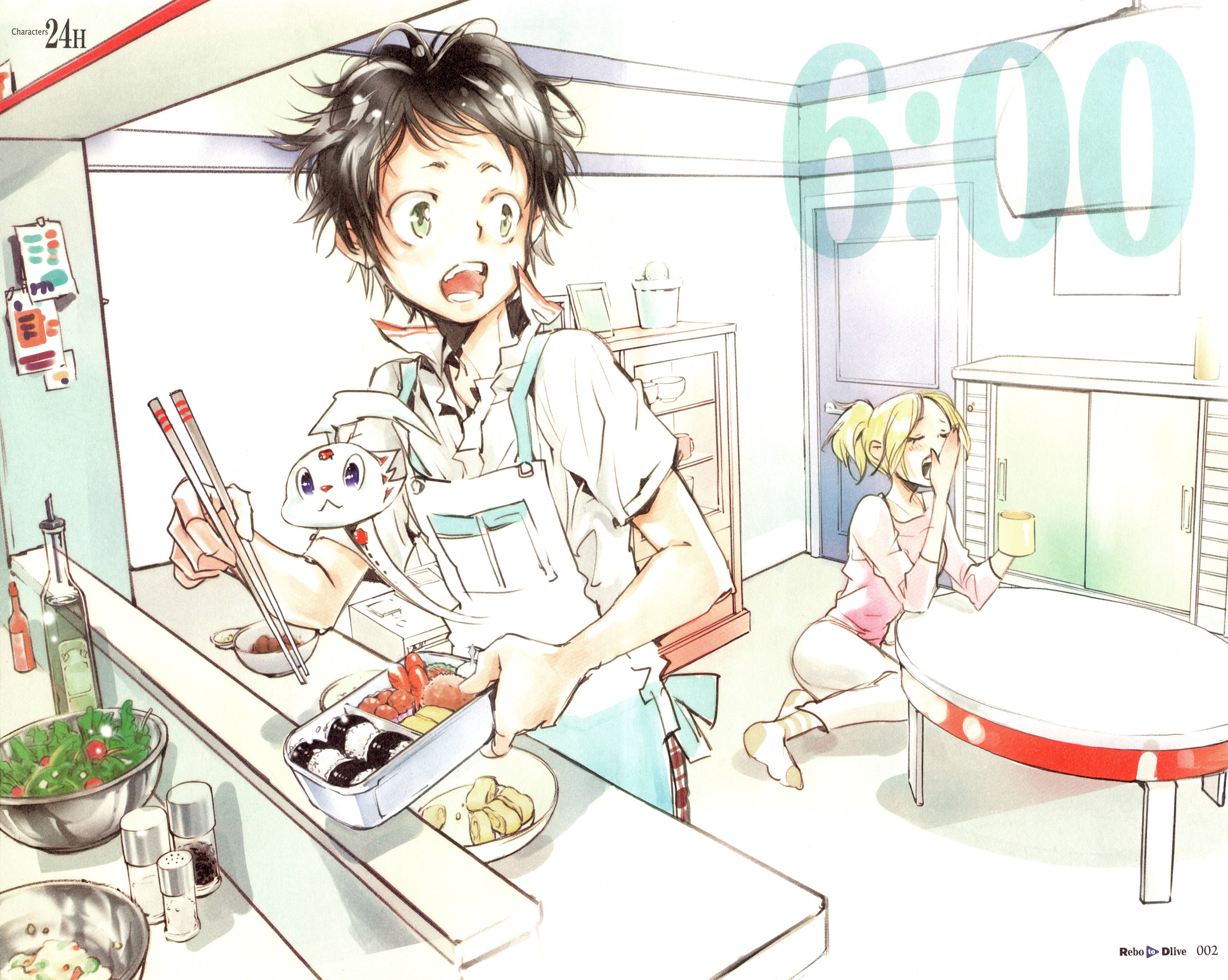 Description: A woman holding a bowl of food in a kitchen with a dog on her lap and a girl sitting at the counter.