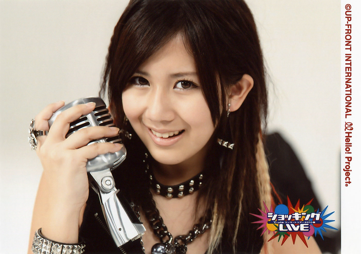 Description: A woman holding a cell phone up to her ear and smiling at the camera with a smile on her face.