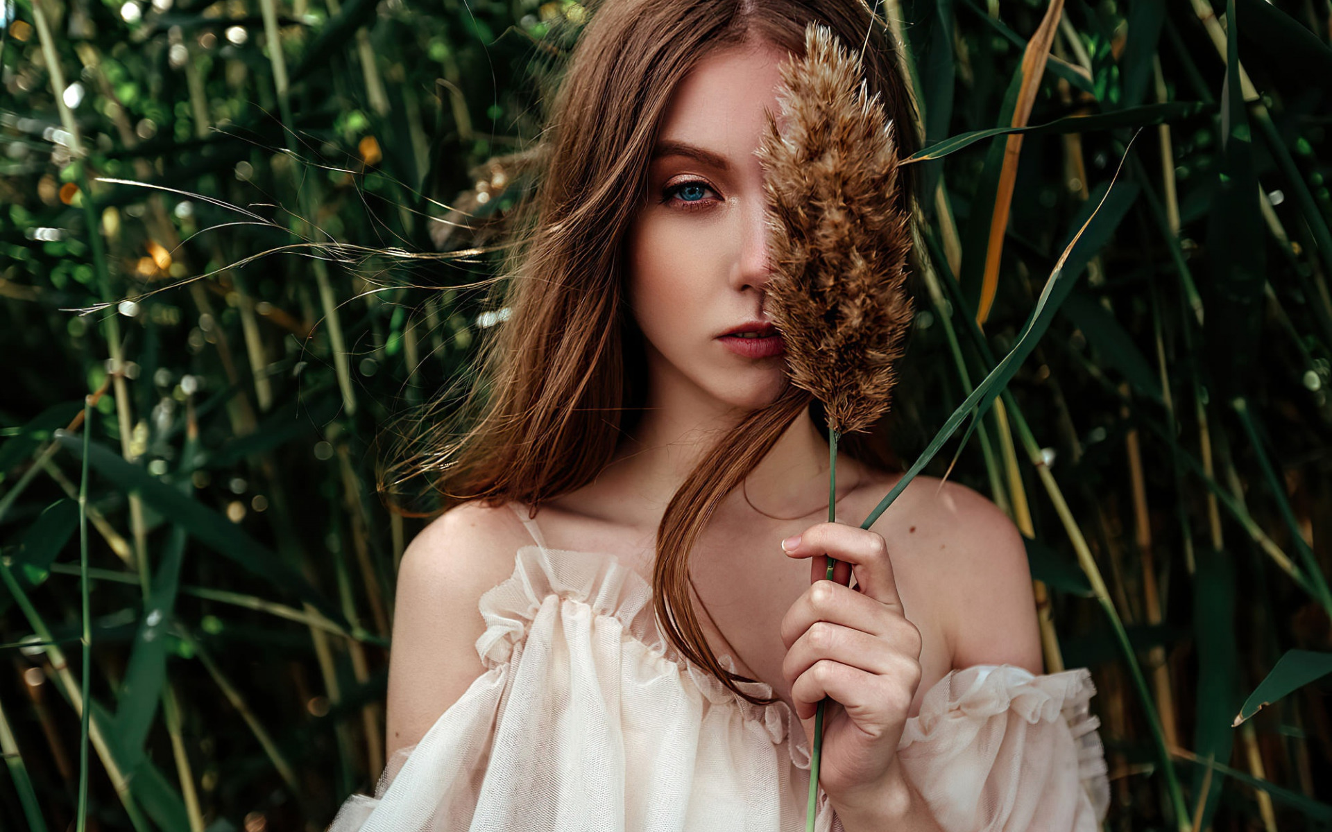 Description: A woman holding a dried plant in her hands and looking at the camera with a serious look on her face.