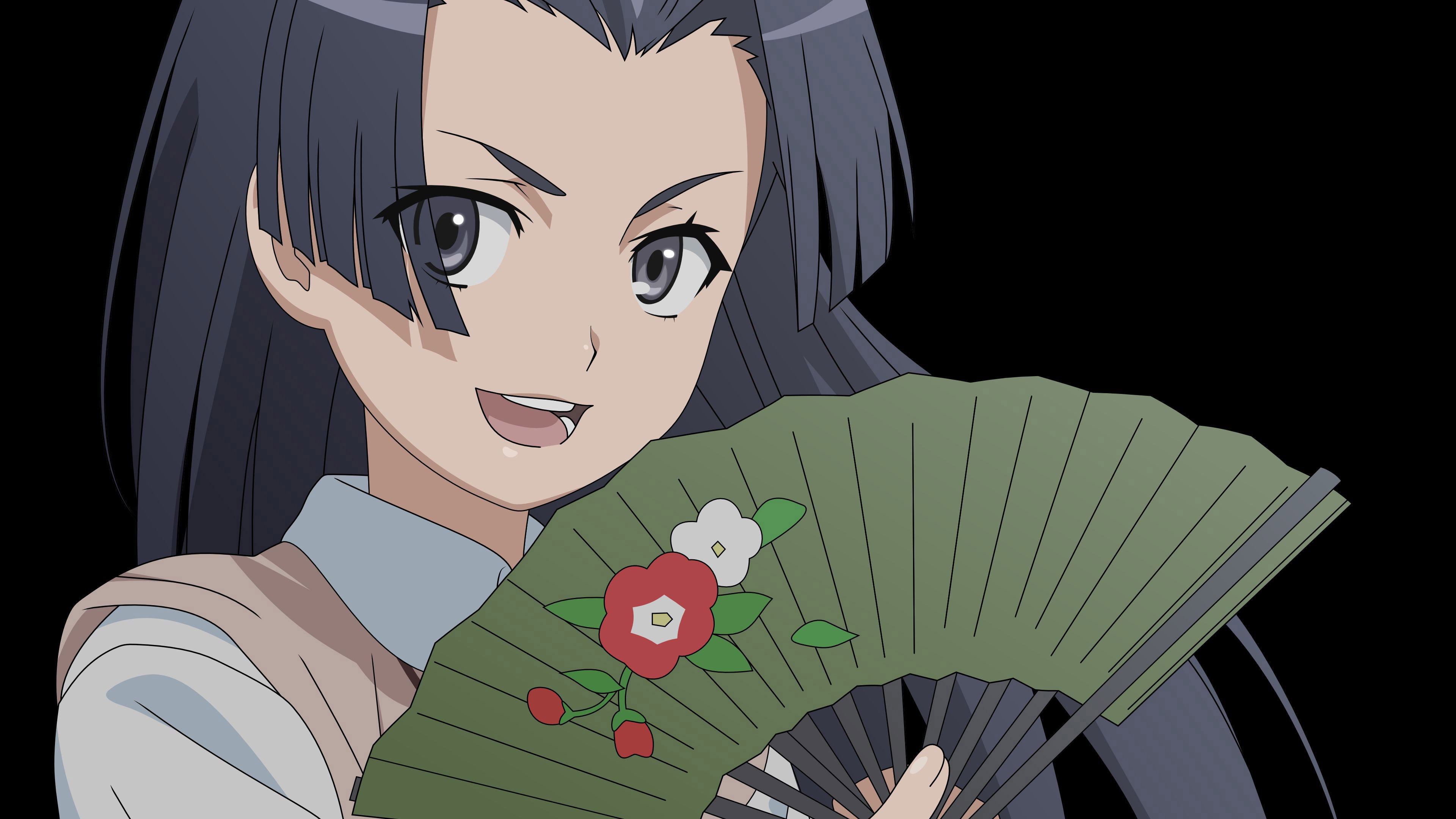 Description: A woman holding a green fan and smiling at the camera with a black background and a black background behind her.
