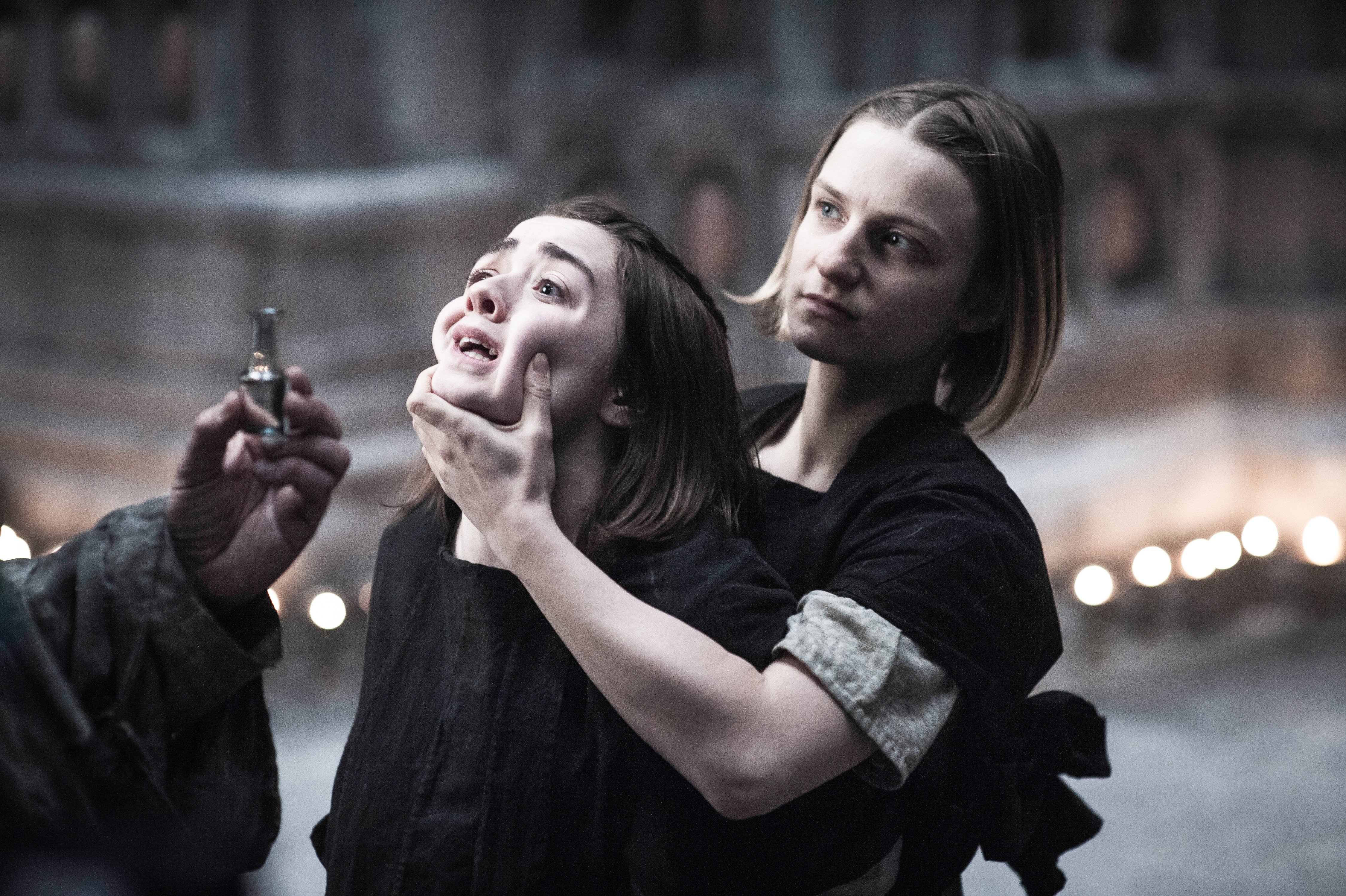 Description: A woman holding a cell phone to her face while another woman looks at her phone in the background with candles on the ground.