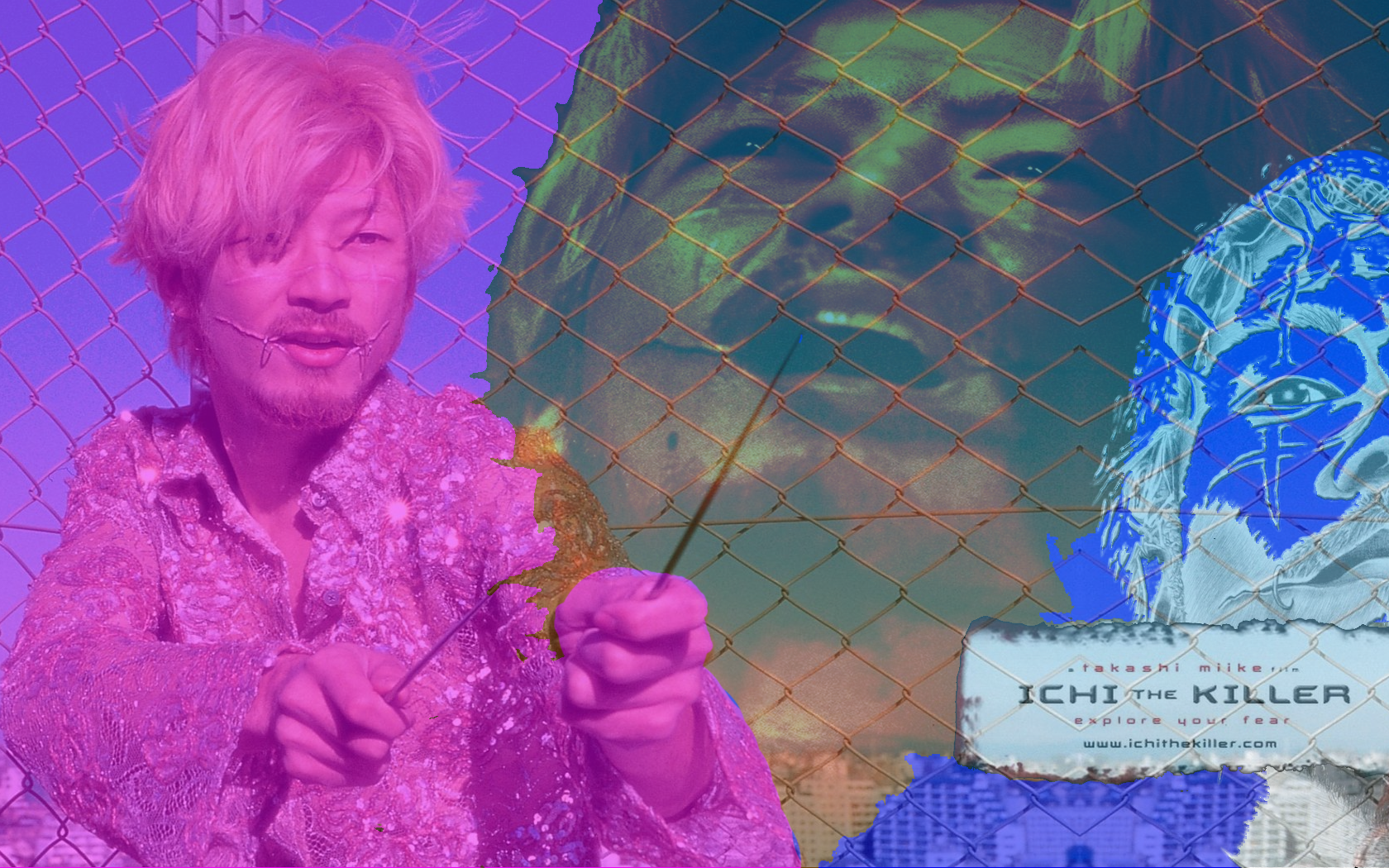 Description: A woman holding a pair of scissors in front of a screen with a picture of a woman behind her.