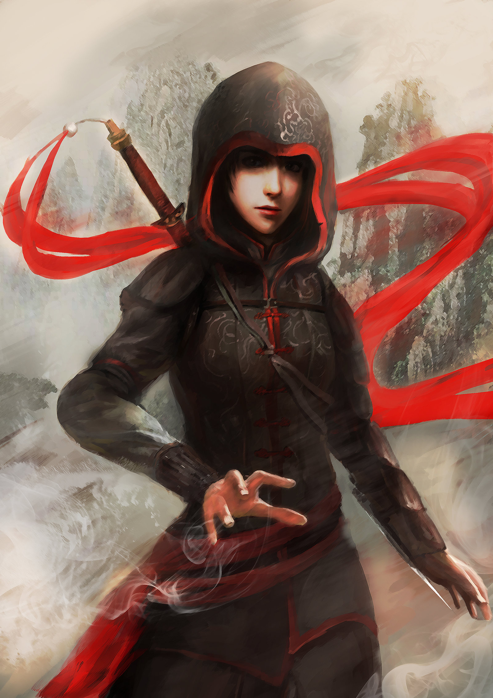 Description: A woman in a hooded jacket holding a sword and a red scarf around her neck and hands in the air.