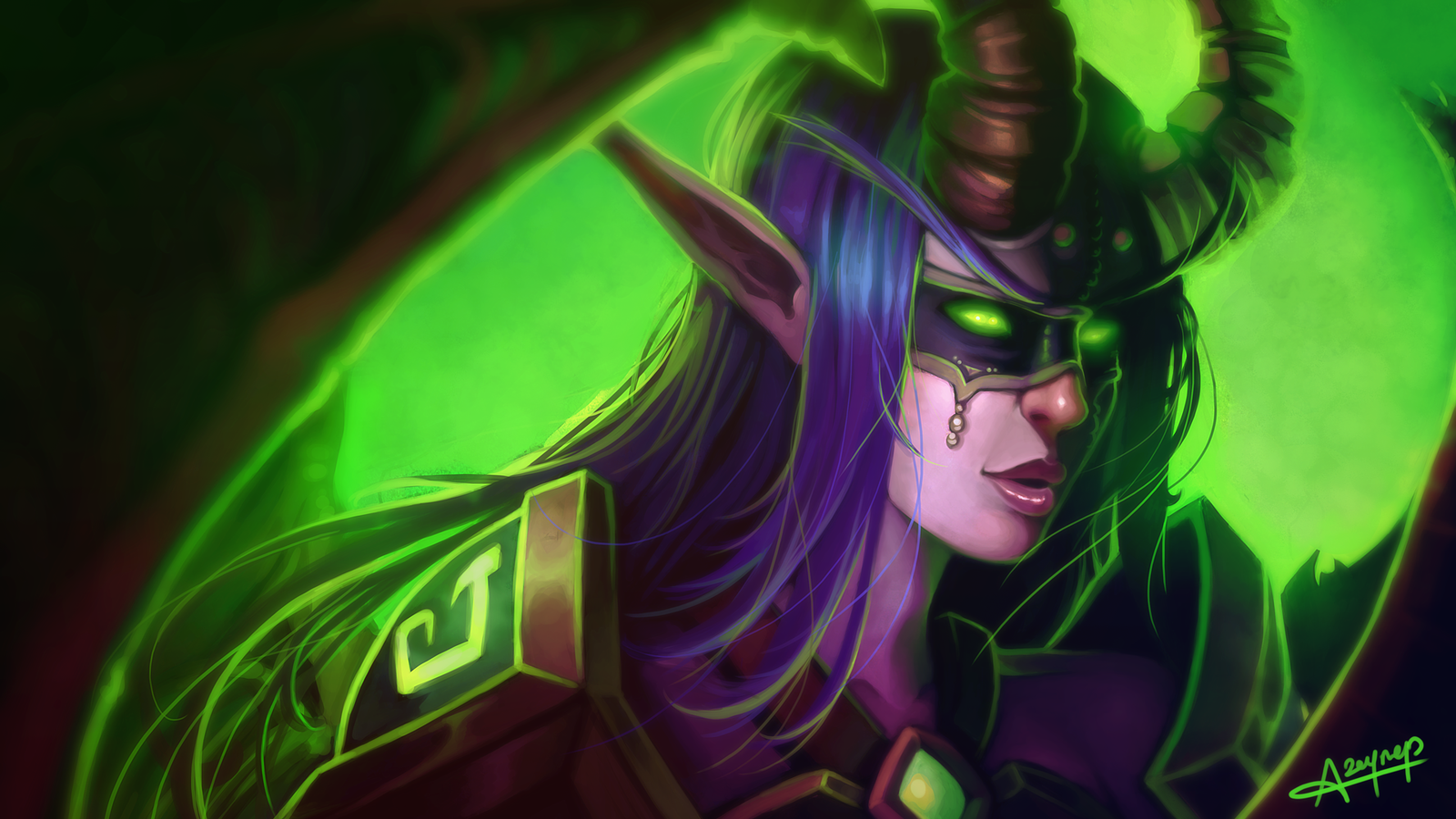 Description: A woman with horns and a horned head is in a green background with a green light behind her and a green light behind her.