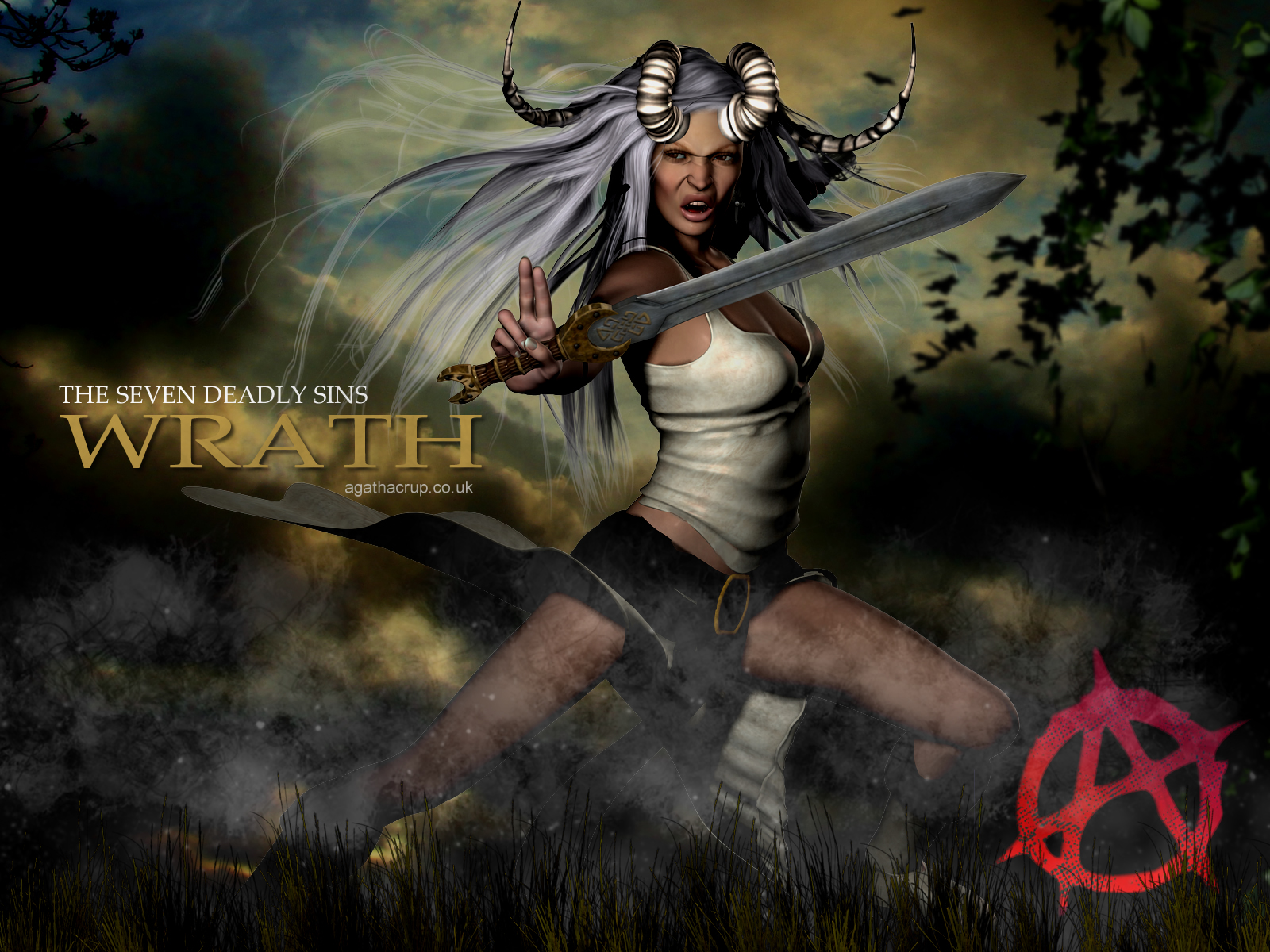 Description: A woman with horns and horns holding a sword in her hands and a demon on her knee behind her.