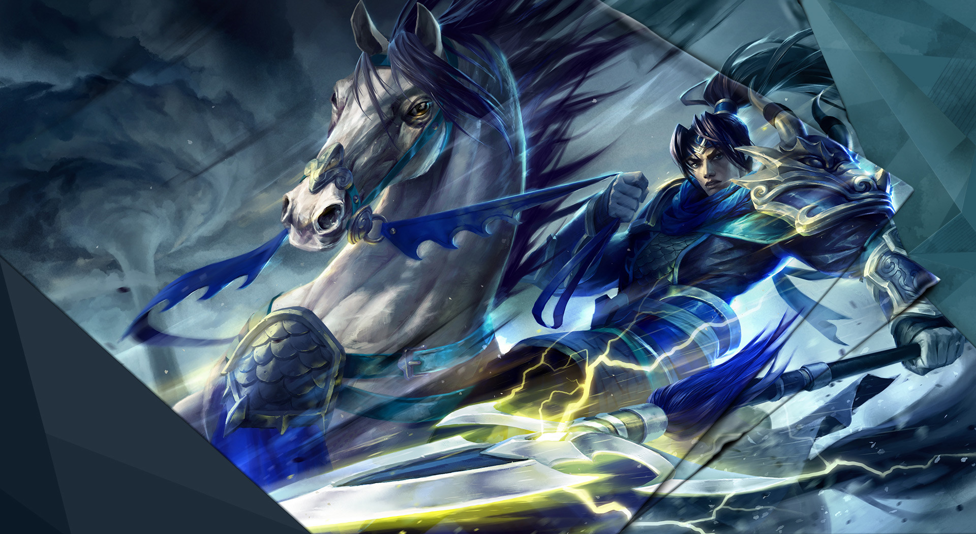 Description: A woman riding a horse next to a white horse in a storm filled sky with lightnings in her hands.