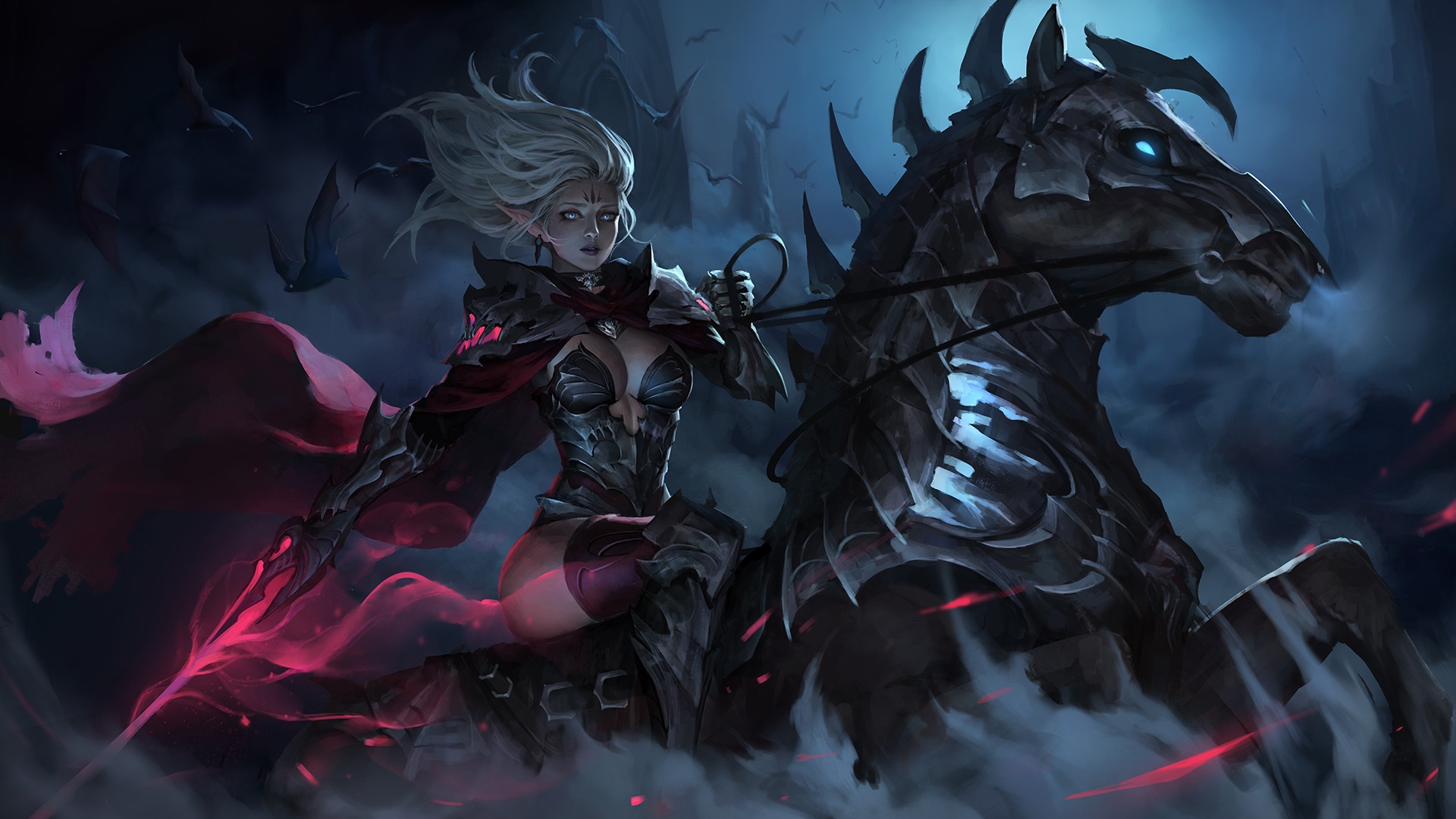 Description: A woman riding a horse with a sword in her hand and a demon on her back.