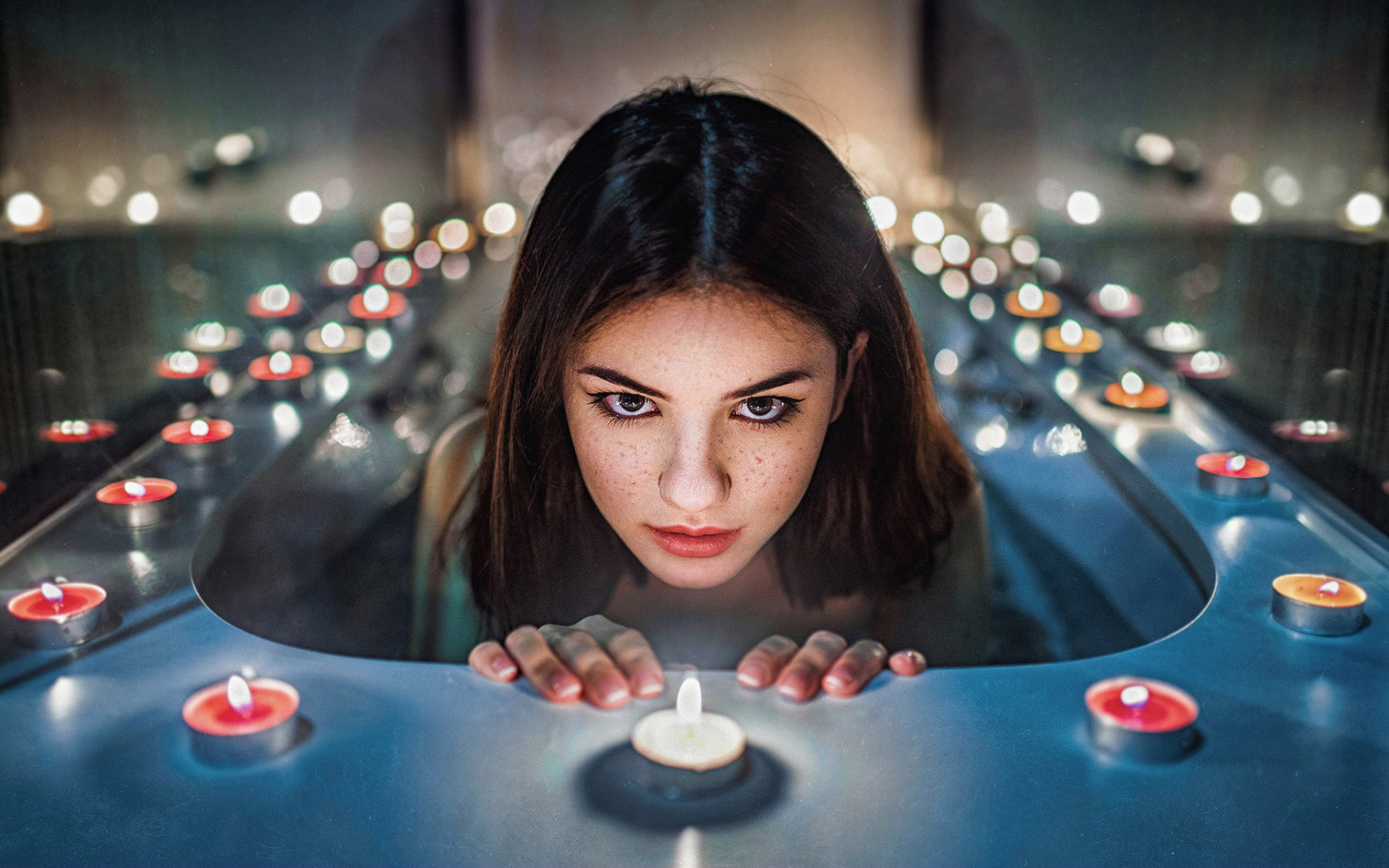 Description: A woman in a hot tub with candles around her head and eyes looking at the camera with a serious look on her face.