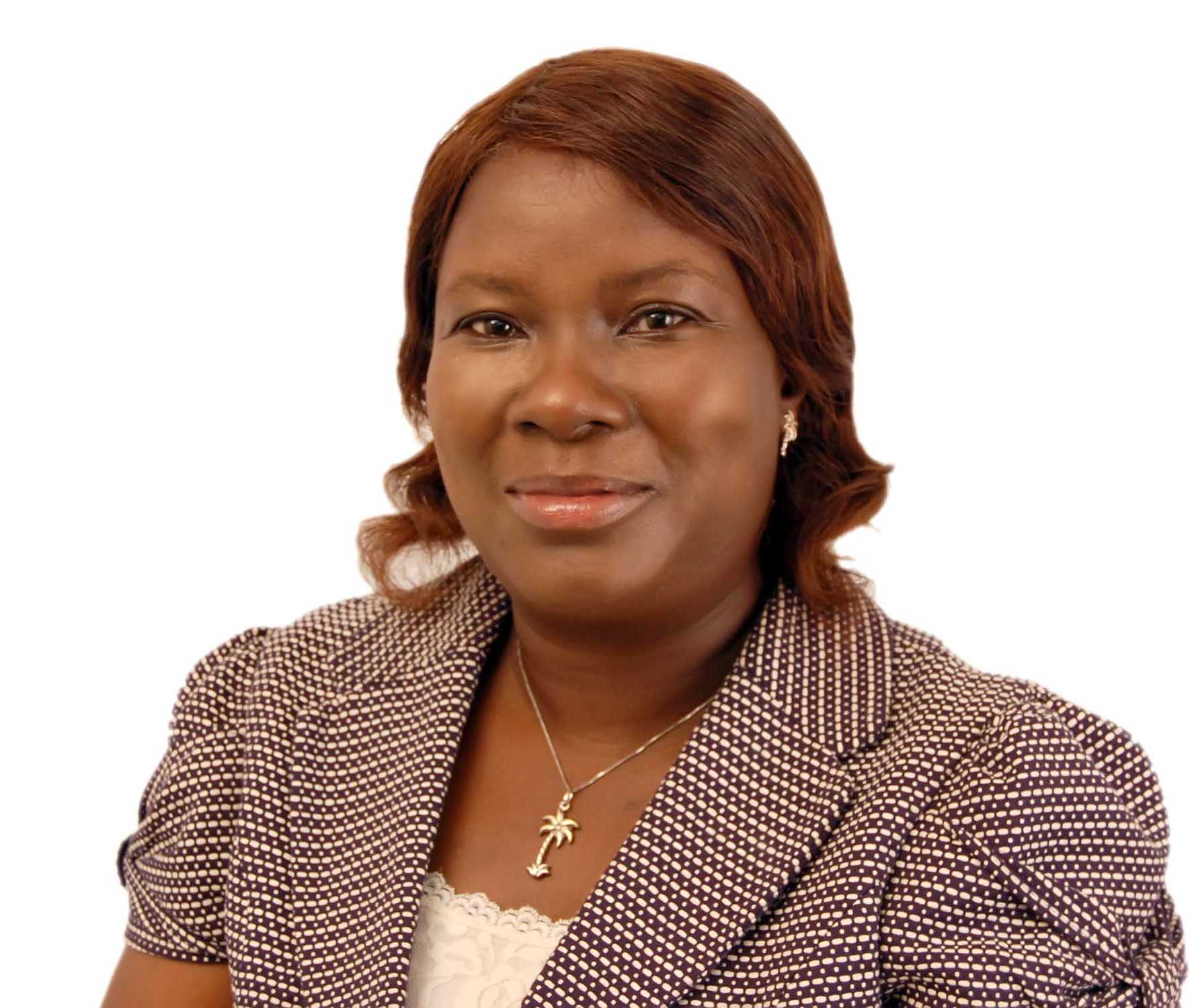 Description: A woman in a jacket and necklace posing for a picture with a white background and a white background behind her.