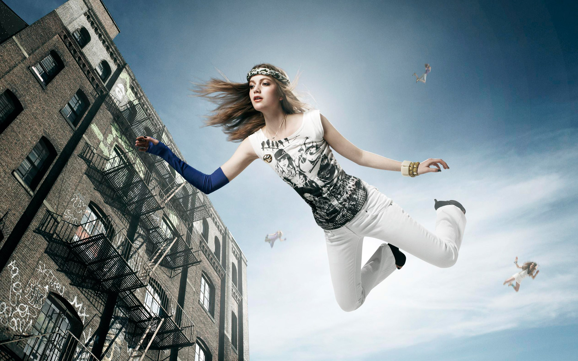 Description: A woman is jumping in the air with a kite in her hand and a building in the background with birds flying around.
